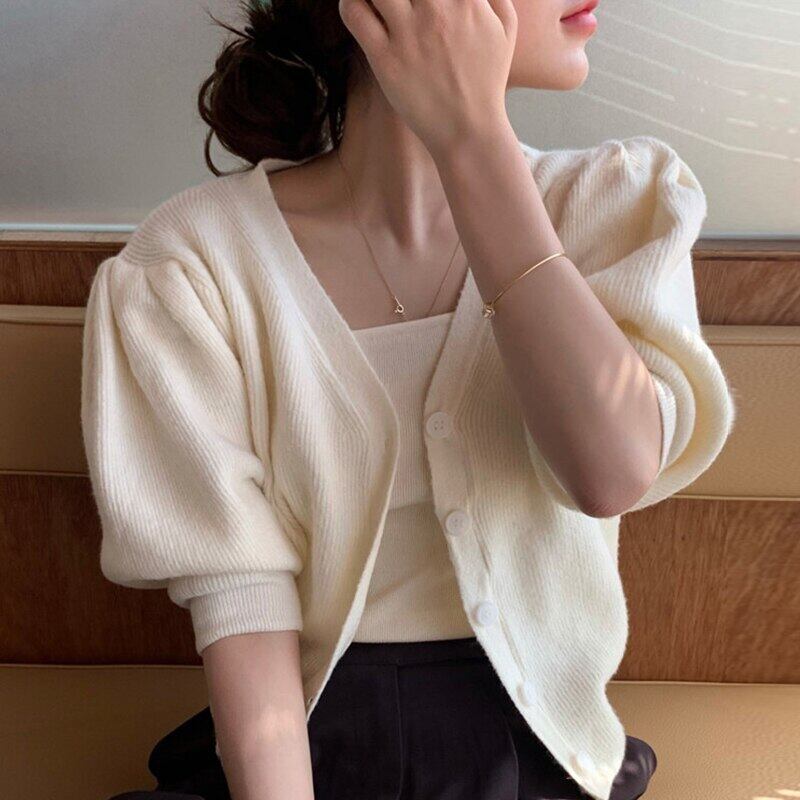 Nomikuma 因果シングルブレストパフスリーブニットカーディガン女性シックな固体 2022 セーターコート甘いニットトップス 大人ガーリー スウィート キュート カジュアル ソリッドカラー kor87900854069