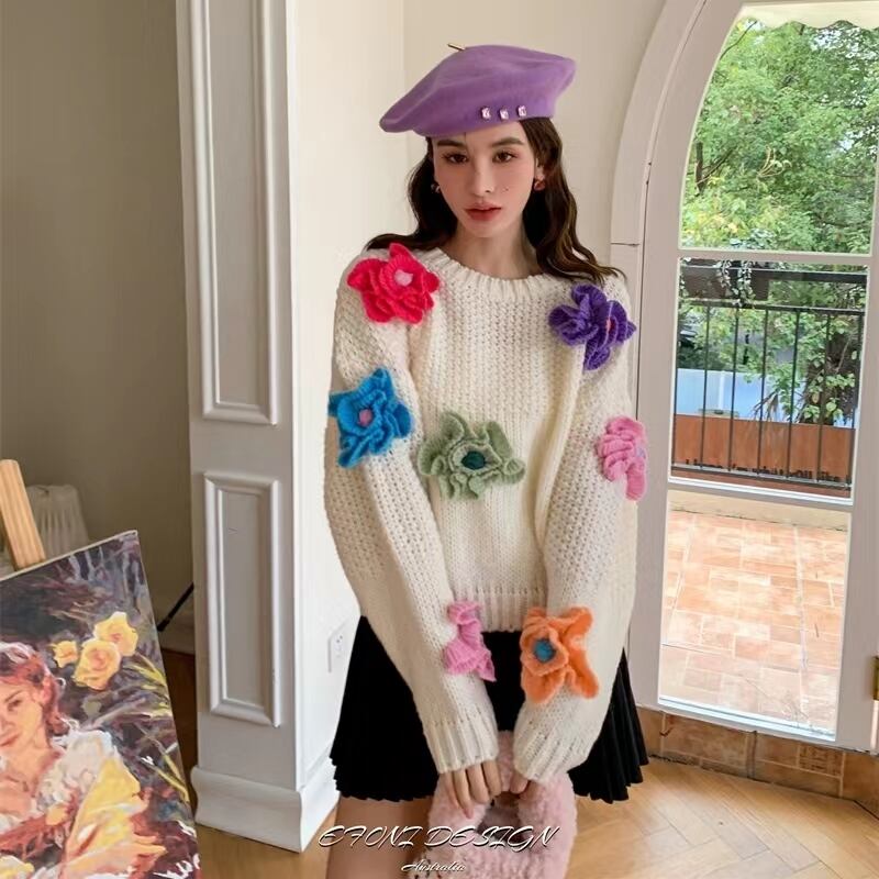 Nomikuma プルシックな 3D 花 O ネックプルオーバーセーター女性秋冬因果 2022 ニットトップジャンパー オータム 秋物 ウィンター 冬物 Oネック フラワーデザイン kor81867138873
