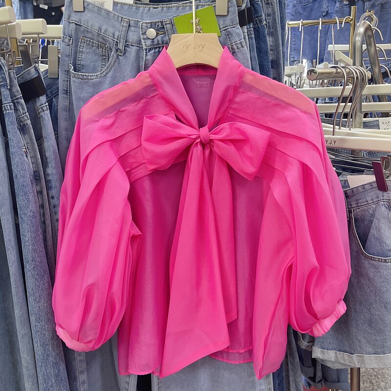 Nomikuma 蝶ネクタイカラー女性シャツ 2022 夏パフスリーブブラウストップス因果ひだデモーダ リボン サマー 夏物 kor45742219084