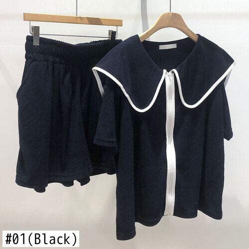Nomikuma 2022 女性セット因果ピーターパン襟半袖ヒットカラージッパートップス + 弾性ウエストショーツ 2 ピース ショート ハーフスリーブ エラスティック 伸縮 ブルマー kor55411668065