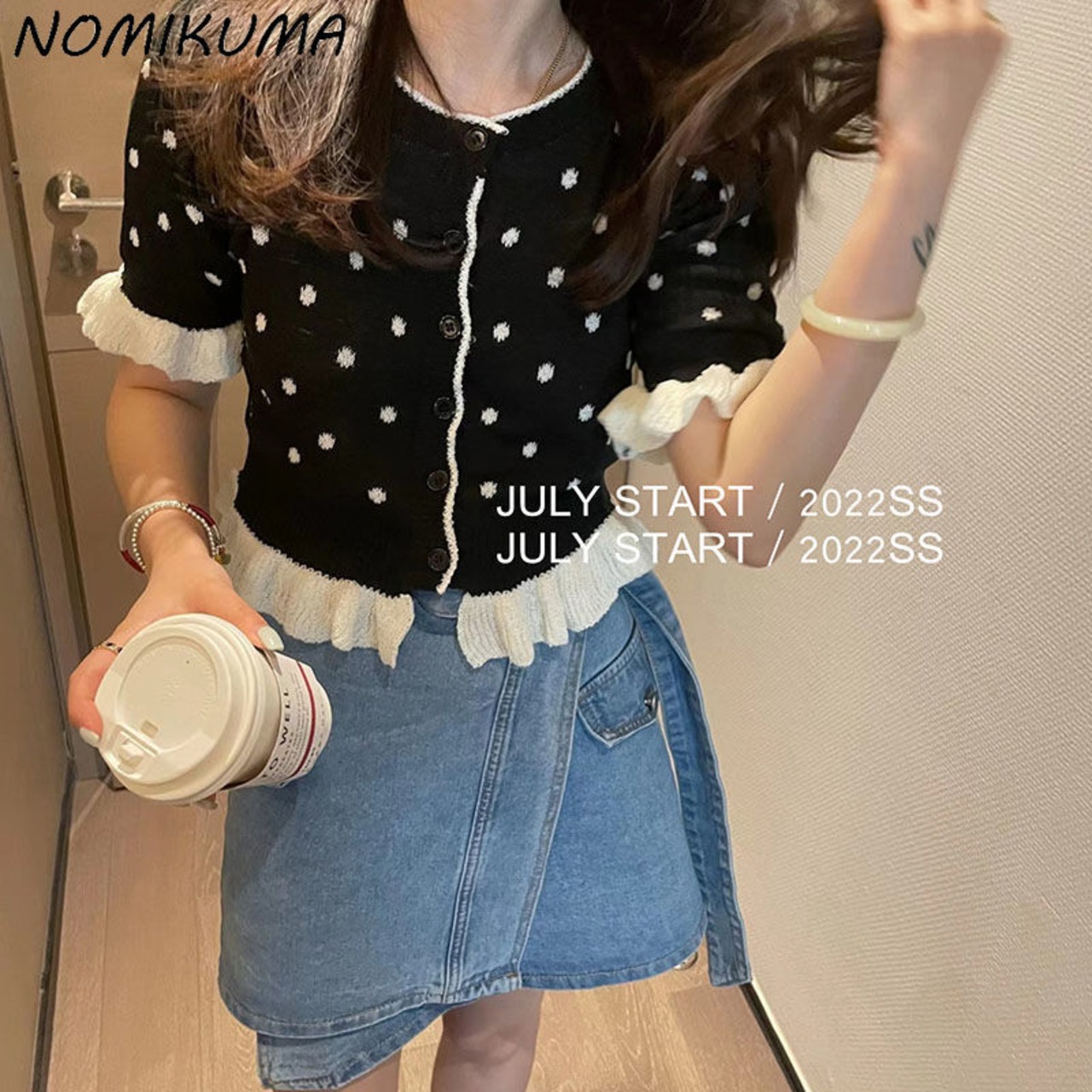 ノミクマ シックドット 半袖ニット 2022年夏 コントラストカラー フリルセーター コート カジュアル スウィート カーディガン ショート ハーフスリーブ 大人ガーリー キュート サマー 夏物 kor41530830928