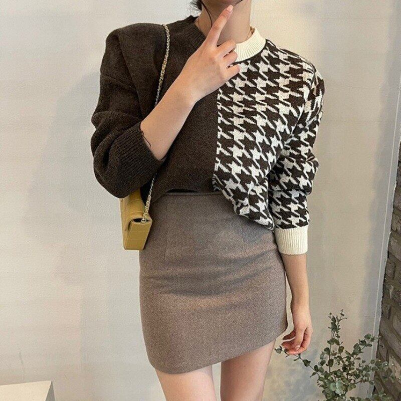 Nomikuma 女性セーター鳥格子コントラストカラーニットプルオーバー 2021 秋冬因果 O ネック基本プル 6L889 オータム 秋物 ウィンター 冬物 Oネック kor73323260843