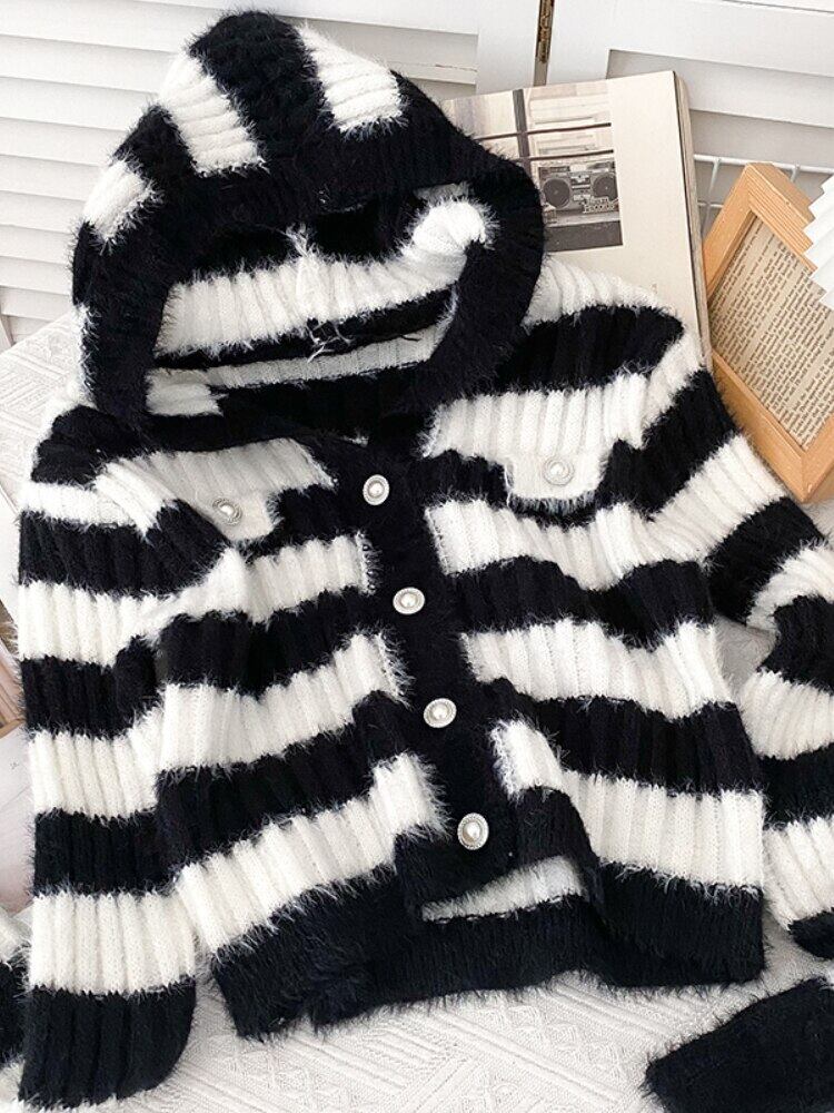 Nomikuma スウィートフード付きシングルブレストストライプ長袖ニットセーターカーディガンコート女性秋冬ニットトップ ロング 大人ガーリー キュート カジュアル オータム 秋物 ウィンター 冬物 kor16885621262