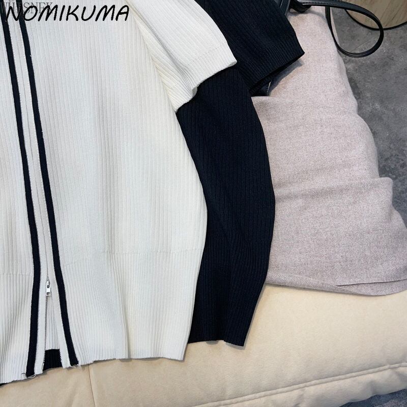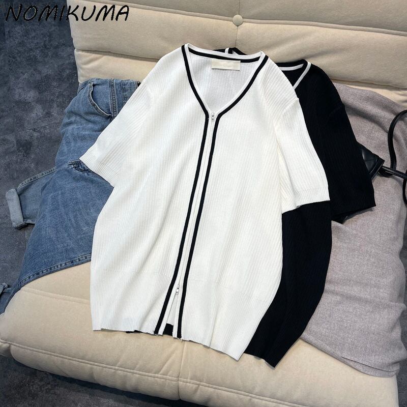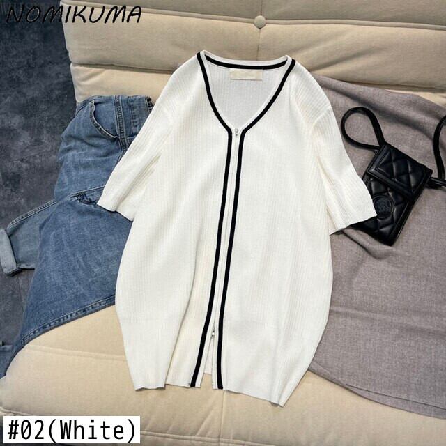 ノミクマ ダブルジッパーニットカーディガン 2022年夏 半袖 ヒットカラー Vネック ニット カジュアル トップス ショート ハーフスリーブ サマー 夏物 kor81842490872