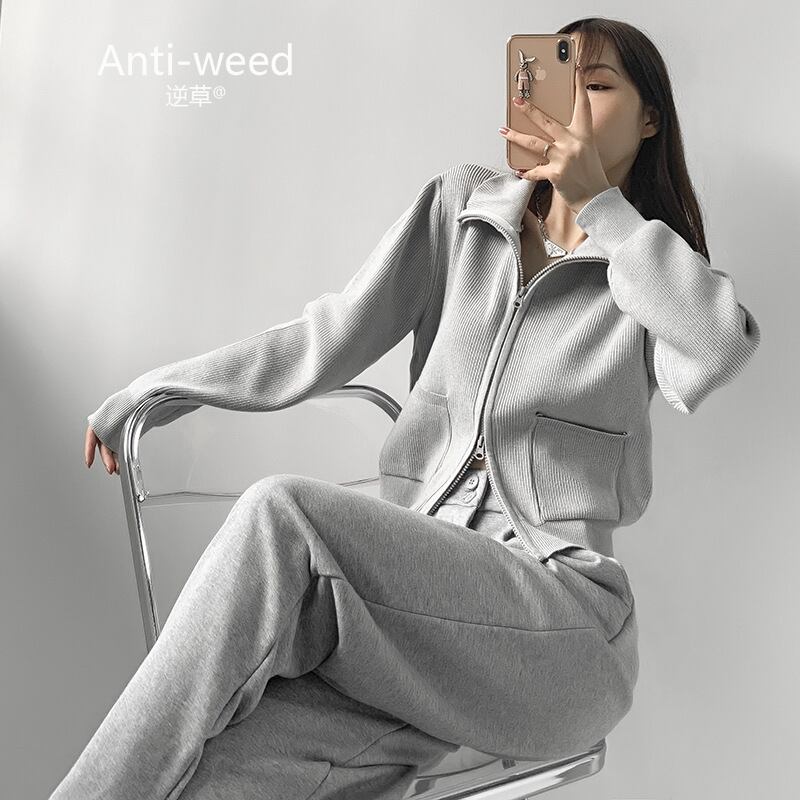 Nomikuma 因果ダブルジッパーカーディガン女性秋長袖セーター 2022 ポケットターンダウン襟クロップニット ロング オータム 秋物 kor69285497206