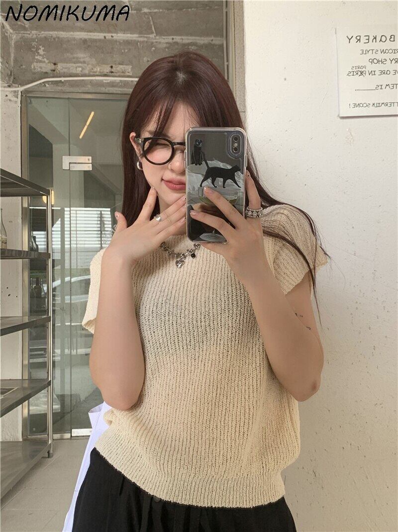 Nomikuma 2022 夏薄いニット半袖 O ネックプルオーバーニットトップス因果無地女性ニットセーター ショート ハーフスリーブ サマー 夏物 Oネック ソリッドカラー kor63242023015