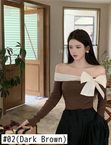 Nomikuma 2022 秋の女性 Tシャツヒットカラー弓包帯オフショルダーセクシーなストラップレススリム長袖グラフィック Tシャツ ロング リボン オータム 秋物 kor47675593690