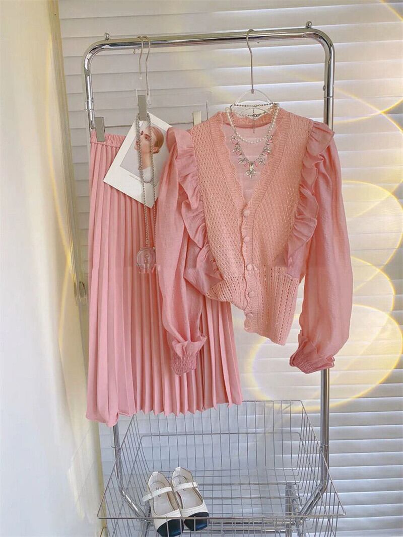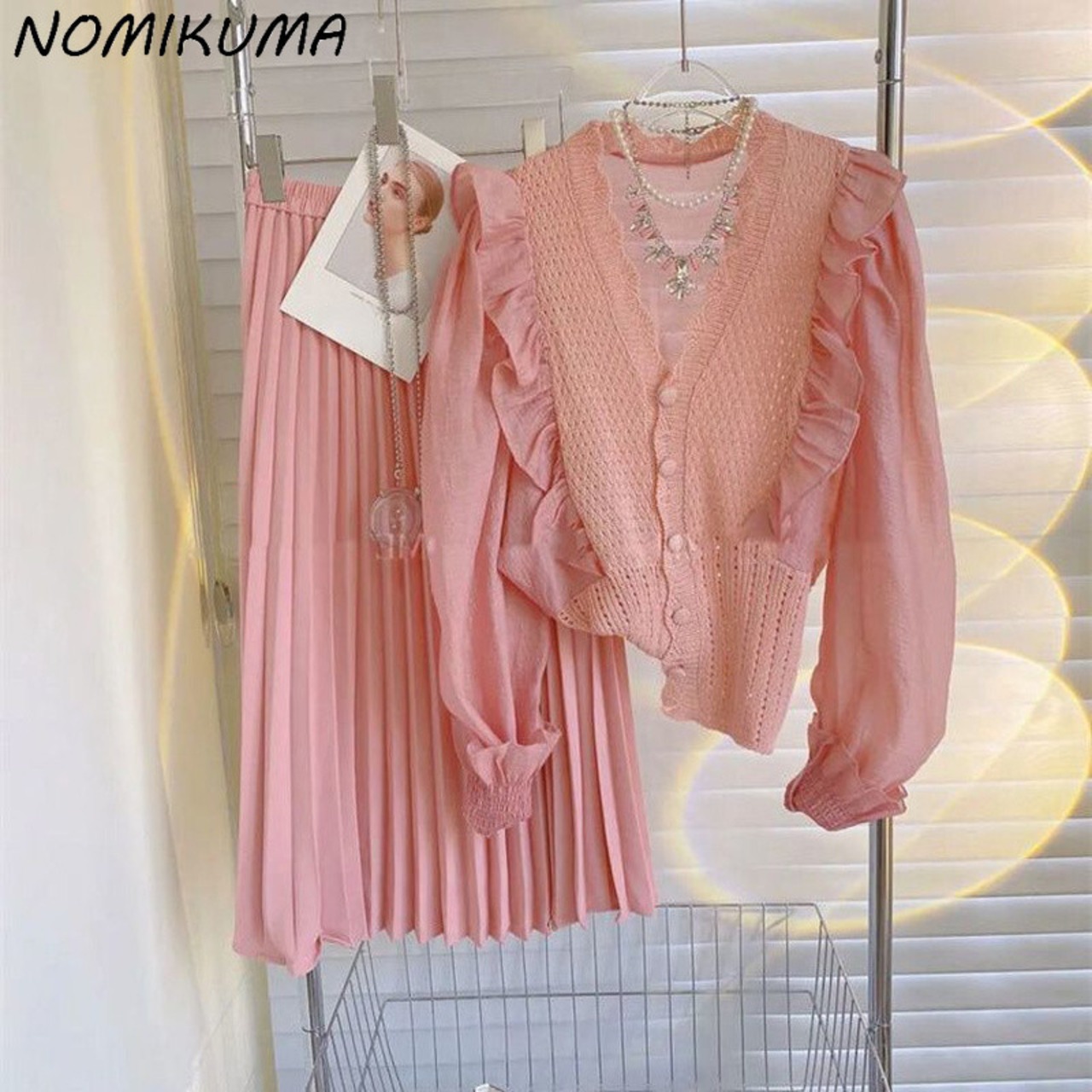 ノミクマ 2022 秋 2点セット レディース コーデ シックなフリル パッチワーク ニット コート + ウエスト カジュアル Aライン プリーツスカート オータム 秋物 kor17580998365