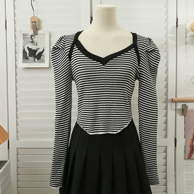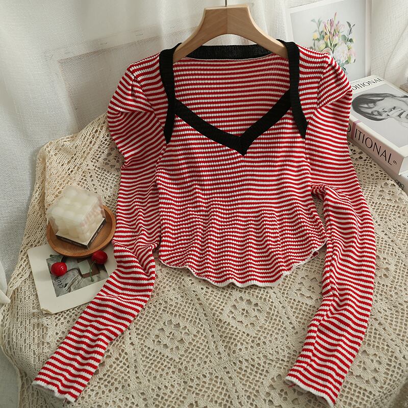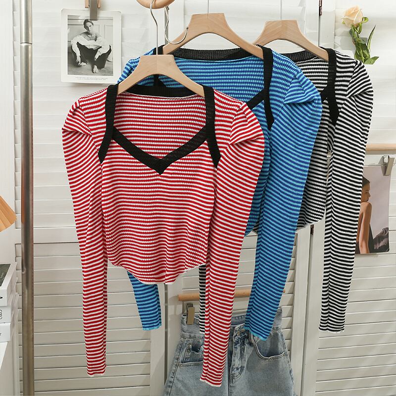 KUSAHIKI ヒットカラースクエアカラーパフ長袖グラフィック Tシャツストライプスリムクロップトップス 2022 秋冬ベーシック Tシャツ ロング オータム 秋物 ウィンター 冬物 スクウェア kor31550748203