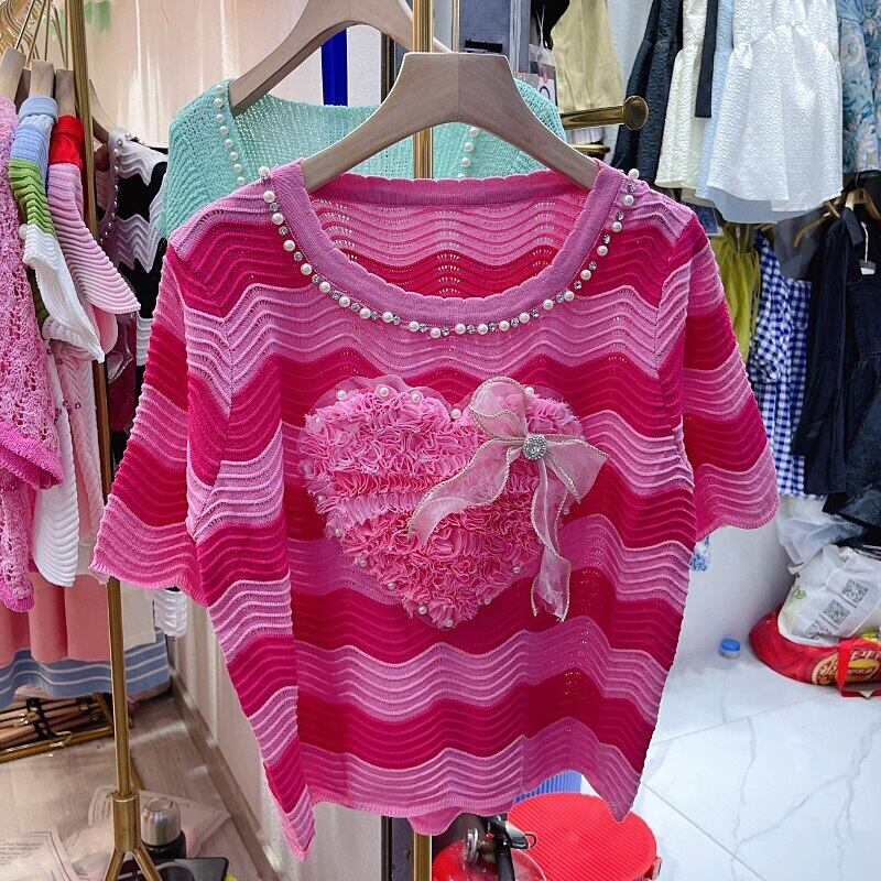Nomikuma ヒットカラーストライプニット女性 2022 半袖 O ネックプルオーバースウィートラブハートちょう結びニットジャンパー ショート リボン ハーフスリーブ 大人ガーリー キュート カジュアル Oネック kor78452123272