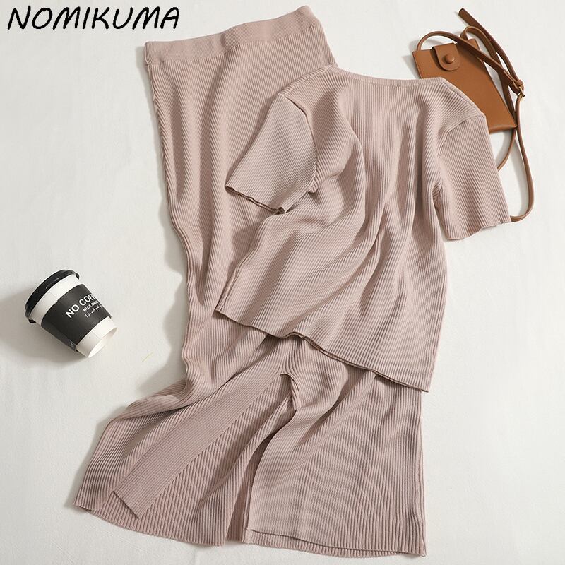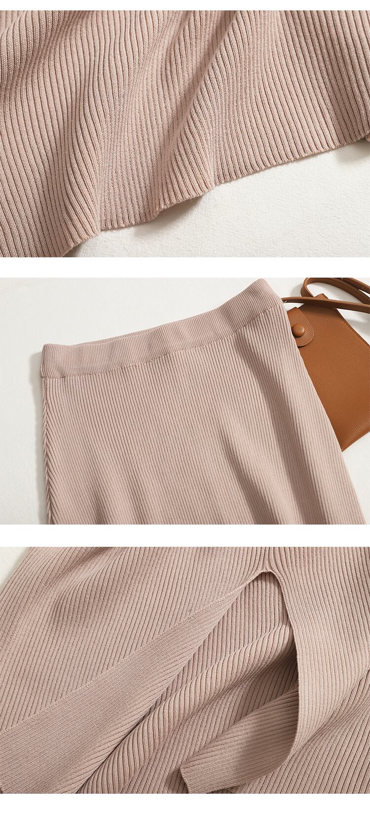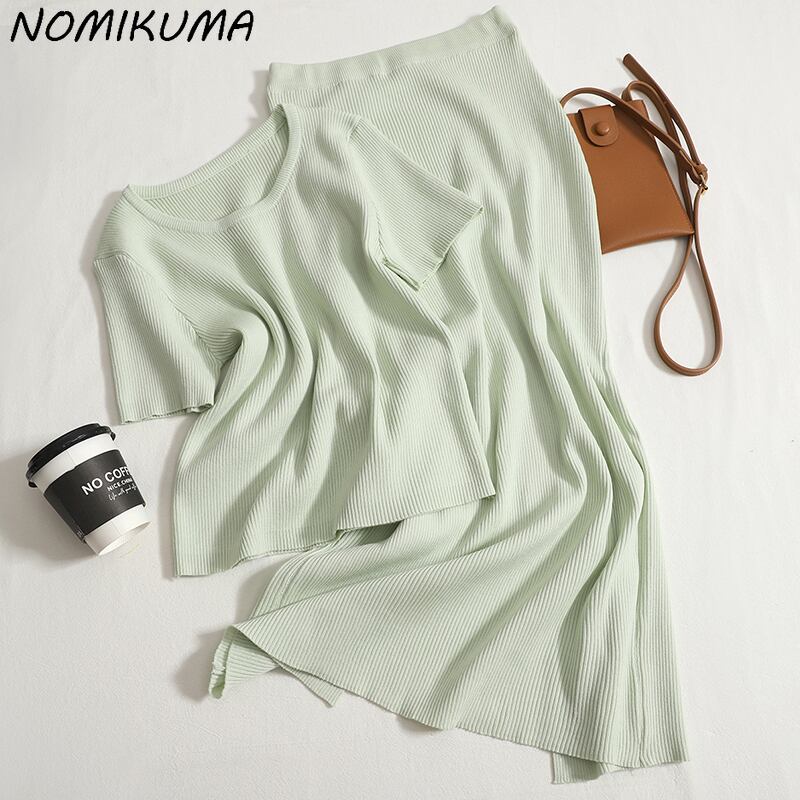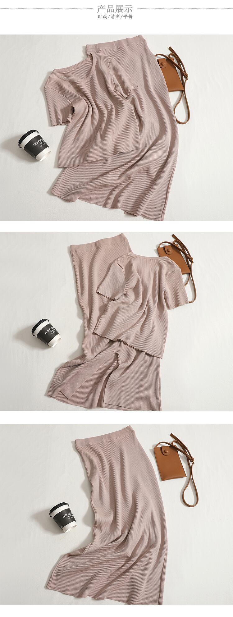N 因果無地ニット 2 ピースセット 2022 夏半袖 O ネックニットトップス + ウエストスプリットスカート女性衣装 ショート ハーフスリーブ サマー 夏物 Oネック ソリッドカラー kor99221603073