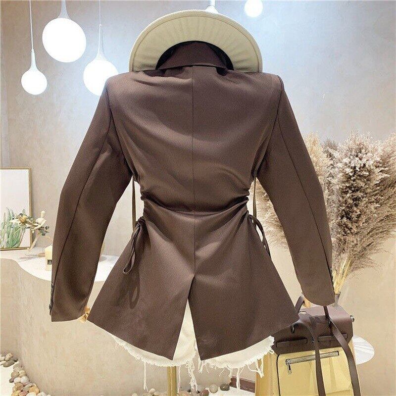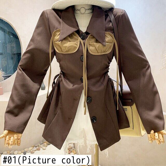 Nomikuma 2021 秋スーツジャケットリボンヒットカラーパッチワーク女性ブレザー巾着スリムウエスト中空アウトバルザーコート オータム 秋物 kor52958001475