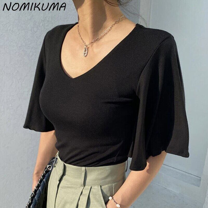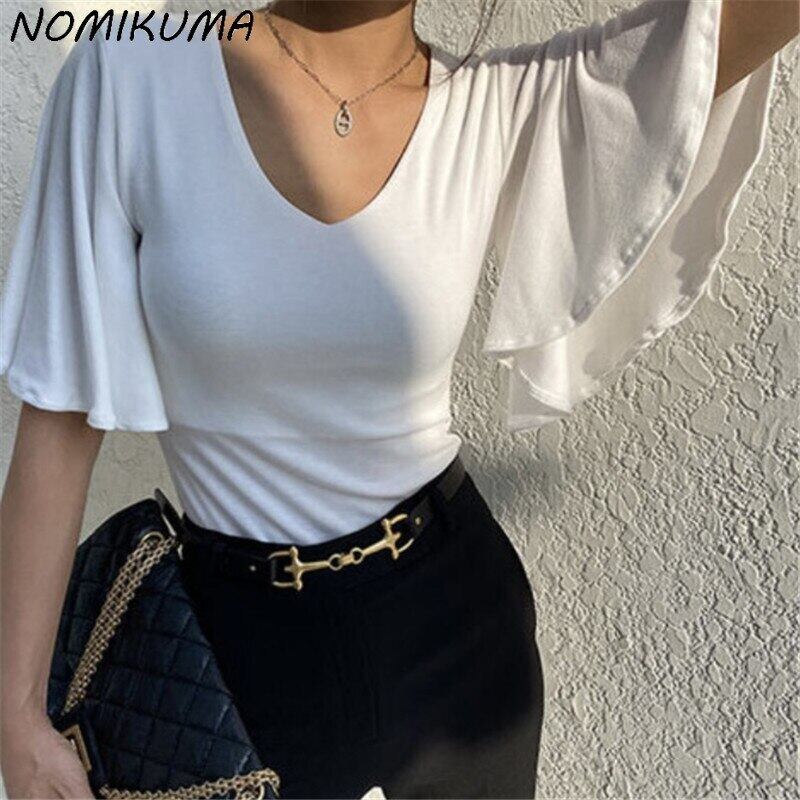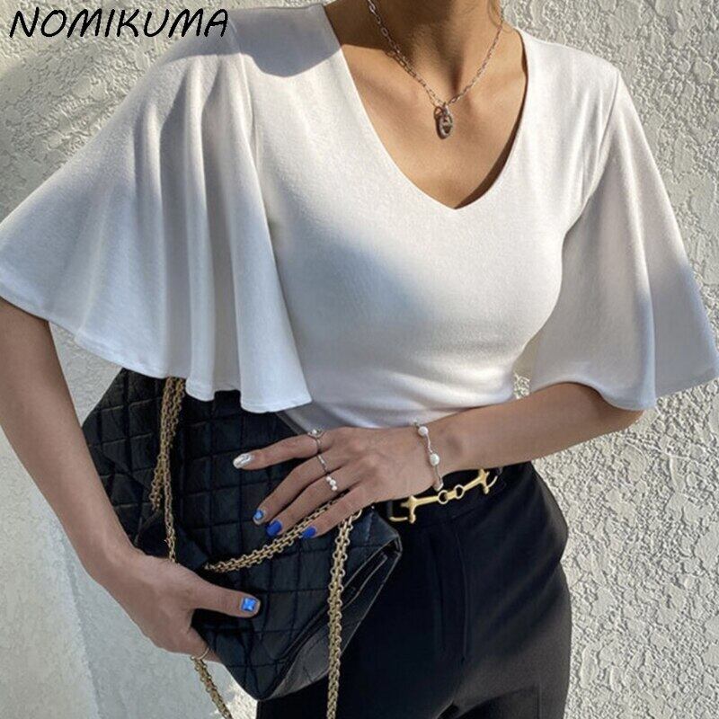 Nomikuma De Moda 2022 夏シックフライングスリーブ女性ブラウス V ネックスリムブラウスシャツ サマー 夏物 Vネック kor82439988839
