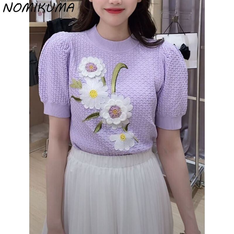 Nomikuma シックな甘い花刺繍ニットセーター因果パフスリーブ O ネックニット 2022 夏ショートプルオーバートップス 大人ガーリー スウィート キュート カジュアル サマー 夏物 花柄 Oネック kor68424825298