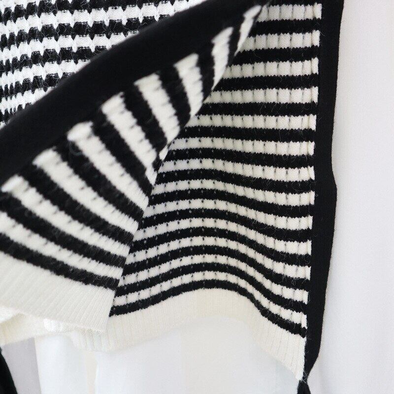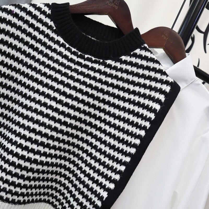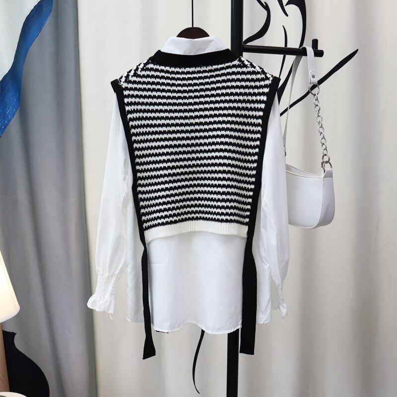 Nomikuma 2022 秋冬因果女性 Stripedknitwear ベストセット + 長袖無地ベーシックブラウスシャツ 2 ピーススーツ ロング オータム 秋物 ウィンター 冬物 ストライプ ソリッドカラー kor84725322985