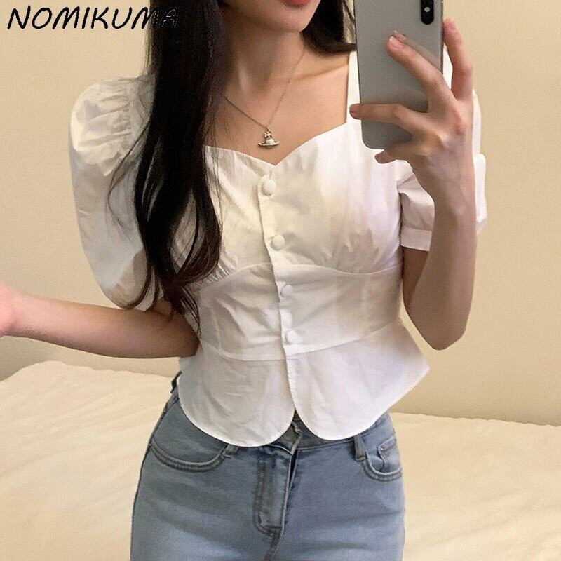 Nomikuma シックな夏の女性シャツスクエアカラーパフスリーブブラウストップス 2022 スリムウエストショートデ サマー 夏物 スクウェア kor10581191898