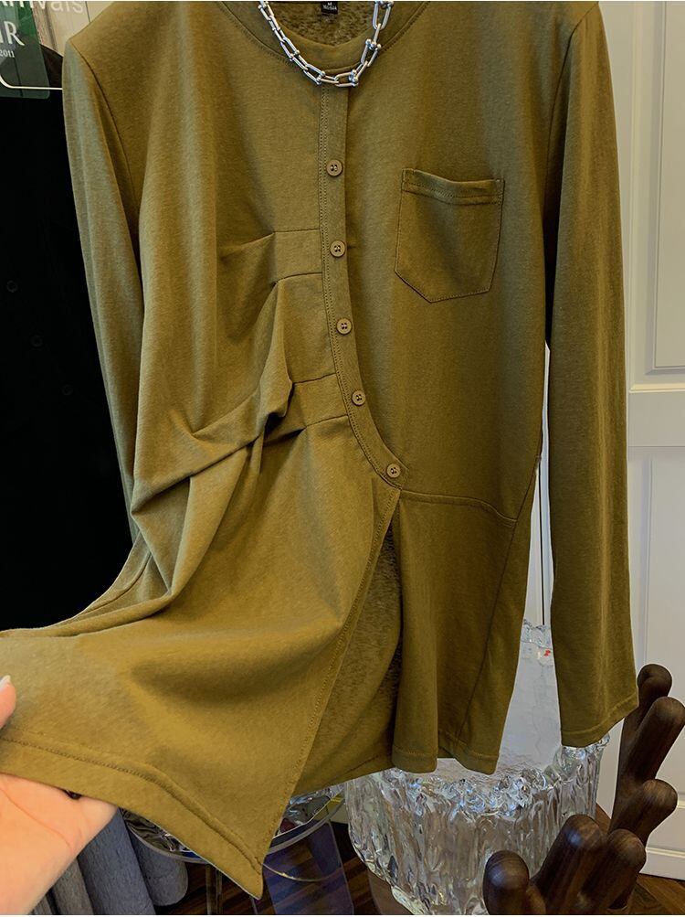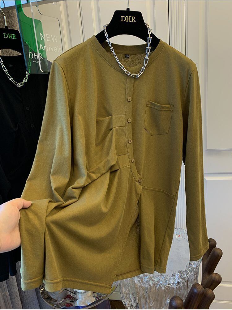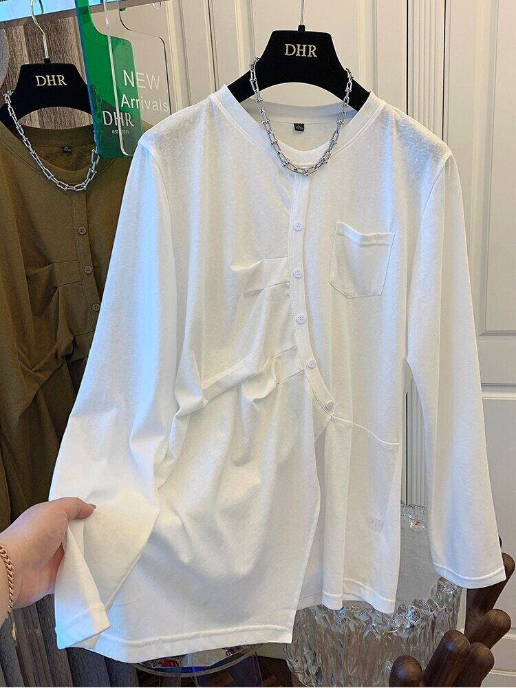 KUSAHIKI 因果不規則なシングルブレスト分割女性トップスシャツ固体 2022 秋長袖 O ネックグラフィック Tシャツ ロング オータム 秋物 Oネック ソリッドカラー kor31779705736