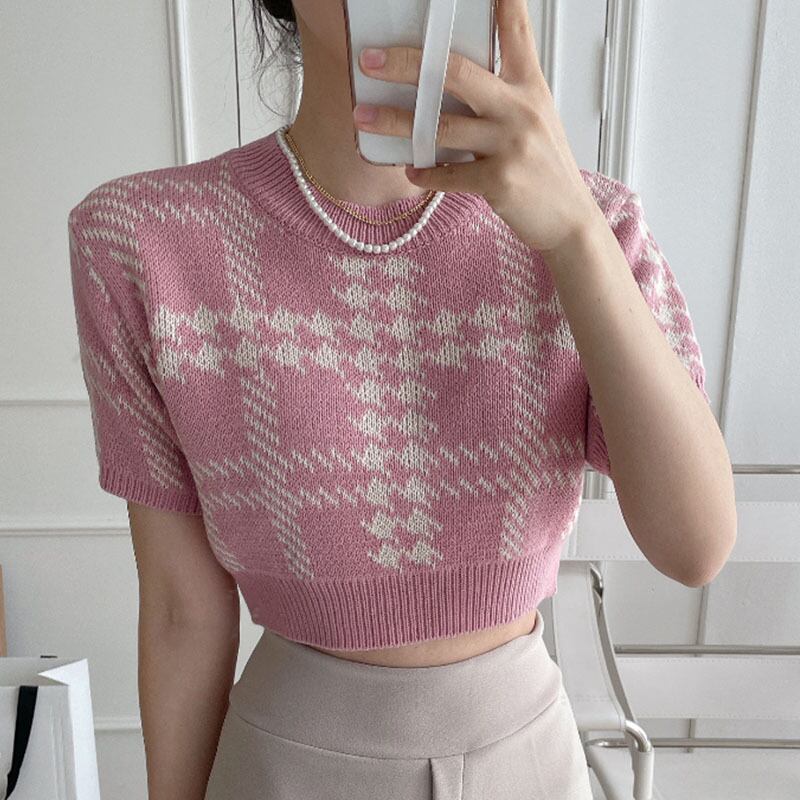 Nomikuma ウエストチェック ショート プルオーバー ニット シック 夏 カジュアル Oネック ニット トップス 2022 セクシー セーター サマー 夏物 kor87689938769