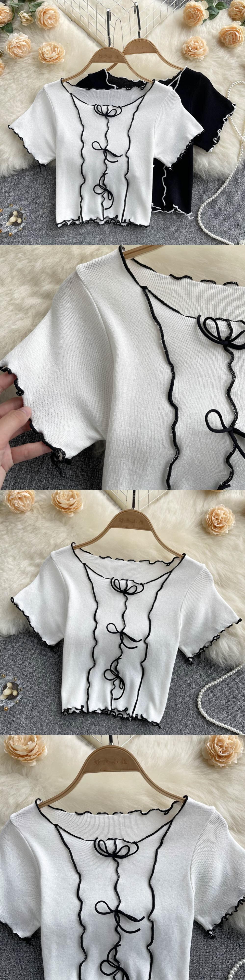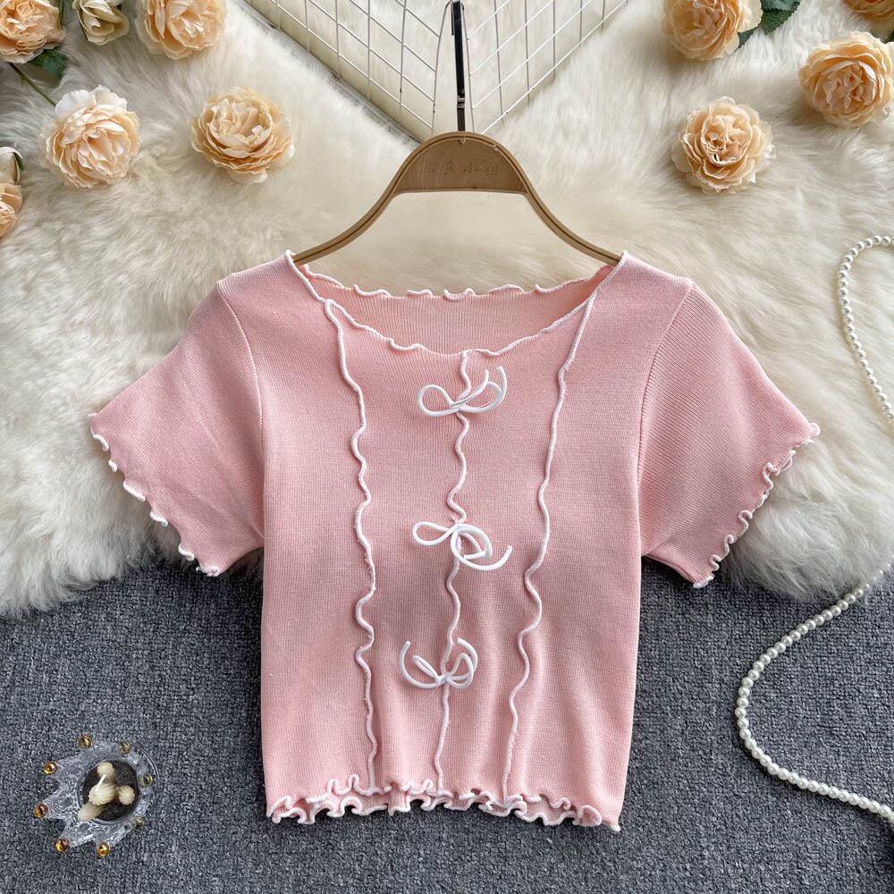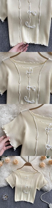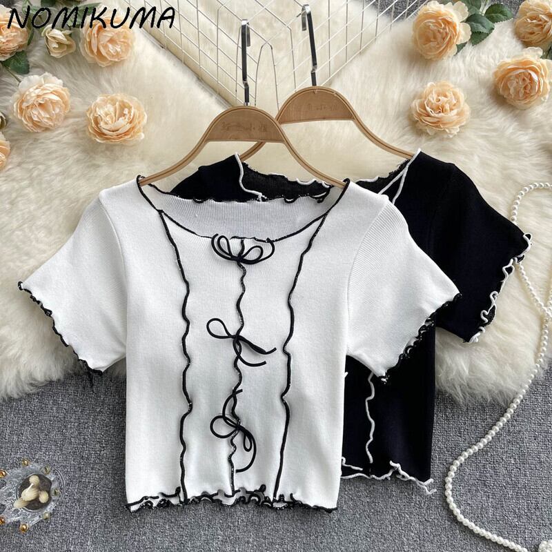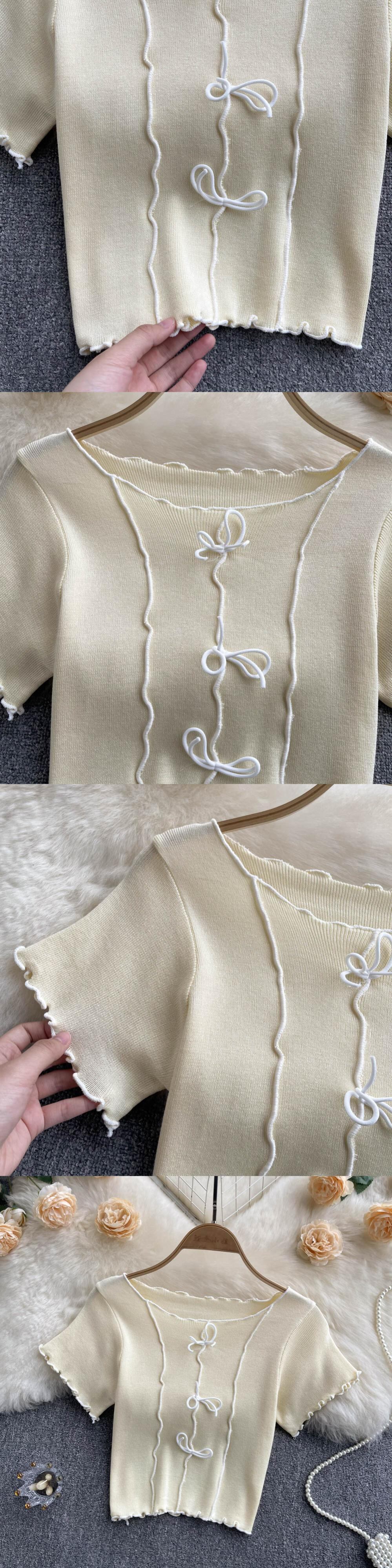 ノミクマ スイートヒットカラー 蝶ネクタイ スリム ショート ニット 袖 Oネック ニット トップス 2022年 夏 シック プルオーバー リボン 大人ガーリー スウィート キュート カジュアル サマー 夏物 kor81024506853