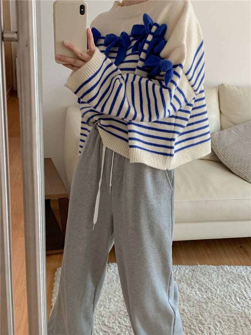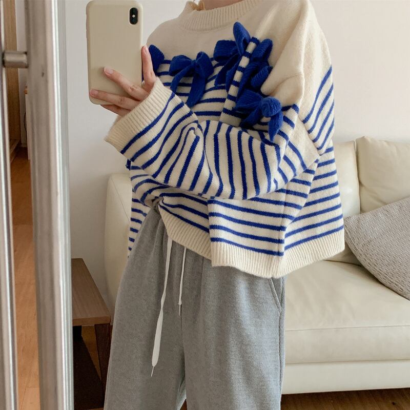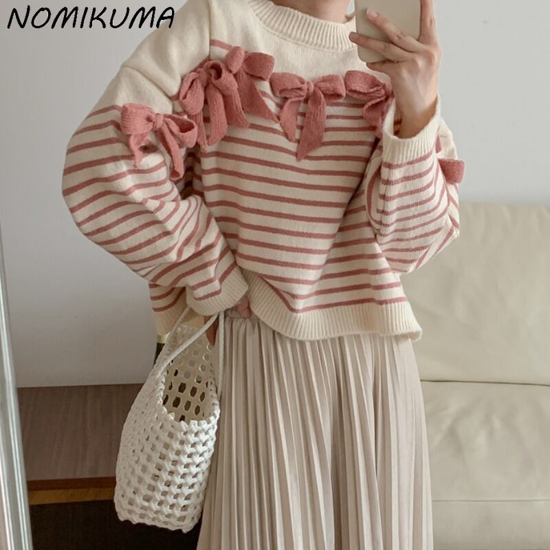 Nomikuma ストライプちょう結びプルオーバーセーター女性 2022 秋冬プル長袖 O ネックニットトップス ロング リボン オータム 秋物 ウィンター 冬物 Oネック kor34035804933