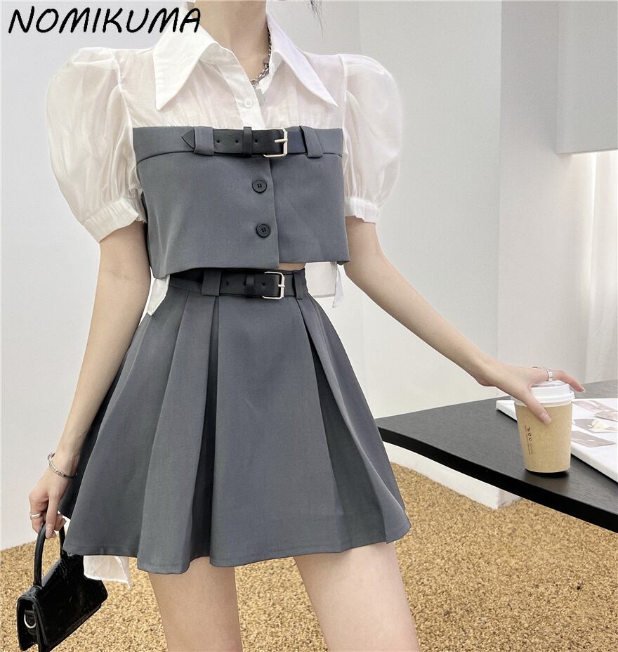 Nomikuma レディース スーツ パフスリーブ コントラストカラー クロップトップ+Tウエスト プリーツスカート スタイル 2点セット kor26534242019