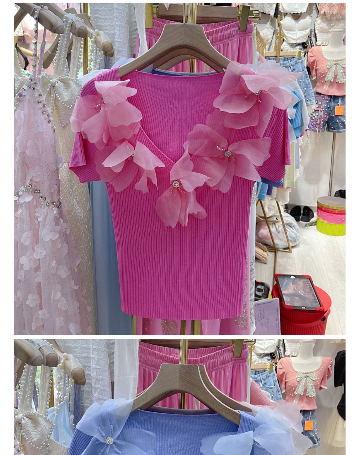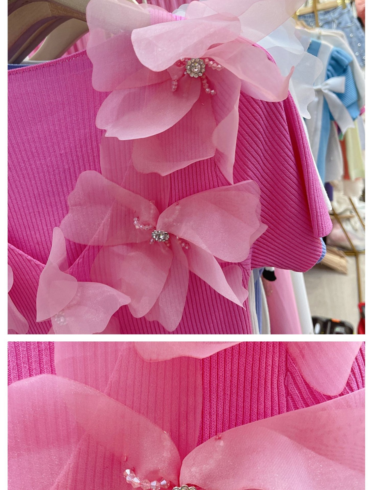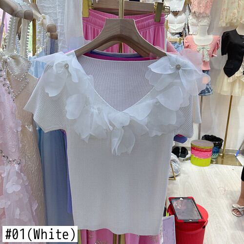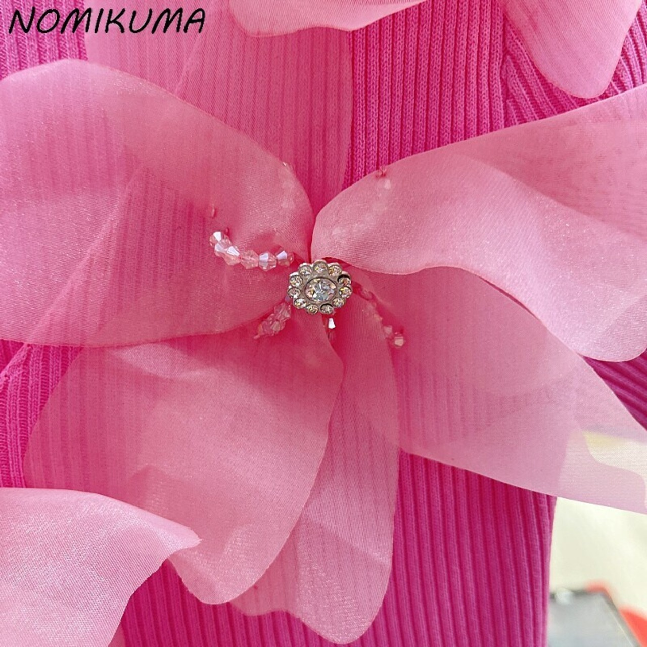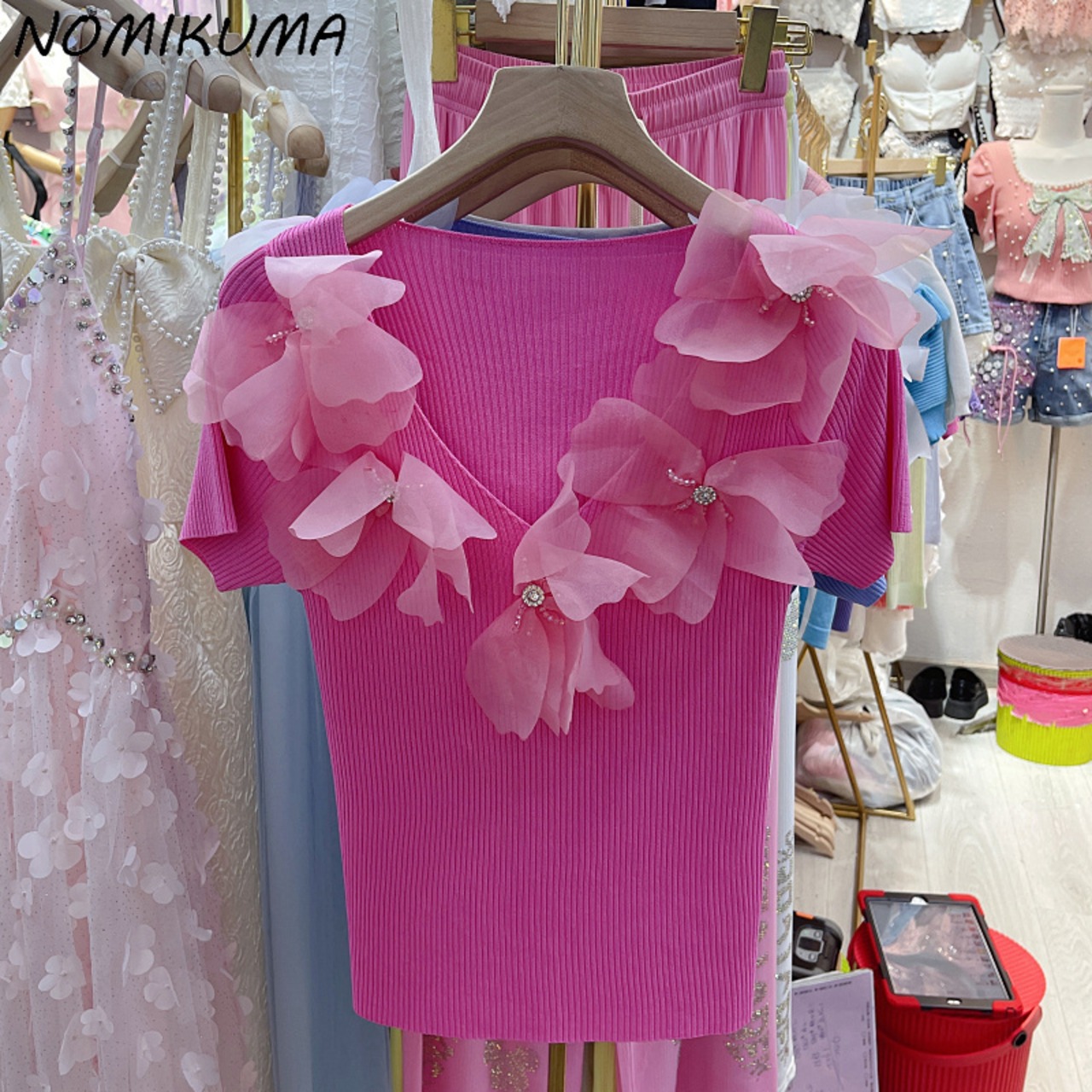 Nomikuma スウィートダイヤモンドビーズ花ニットウェア半袖 2022 夏の女性ニットトップススリムセーター ショート ハーフスリーブ 大人ガーリー キュート カジュアル サマー 夏物 フラワーデザイン kor96525695980
