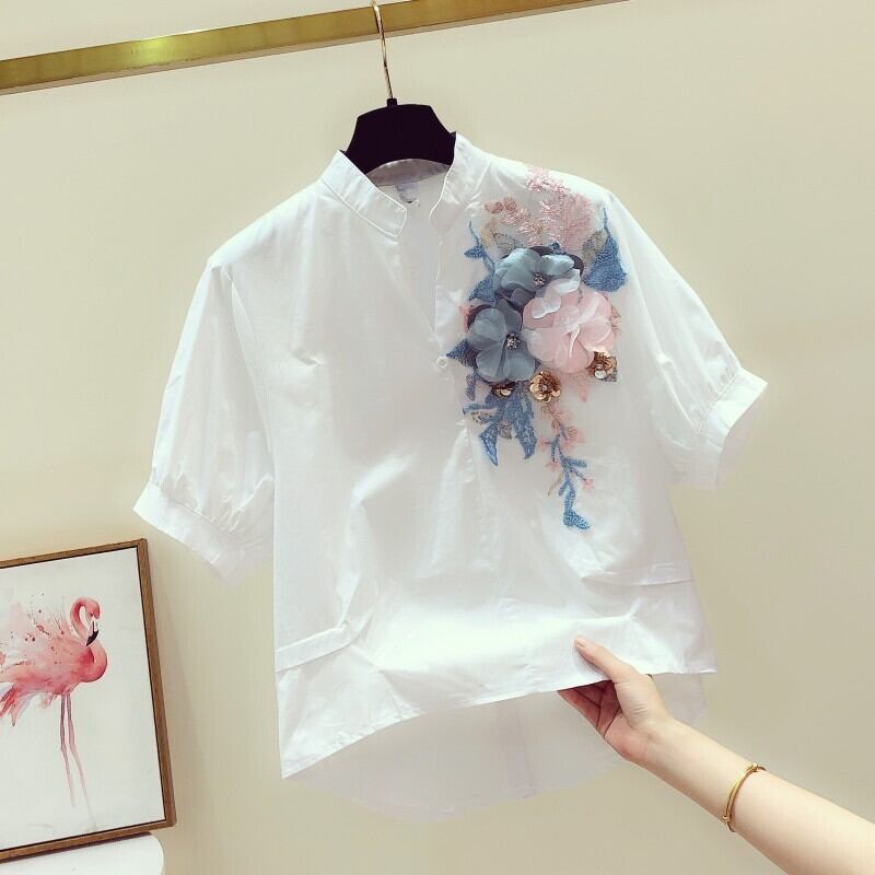 Nomikuma 2022 夏ビーズ刺繍フラワーステッチ V ネック半袖ブラウスシャツレディースデ サマー 夏物 Vネック フラワーデザイン kor8512365667