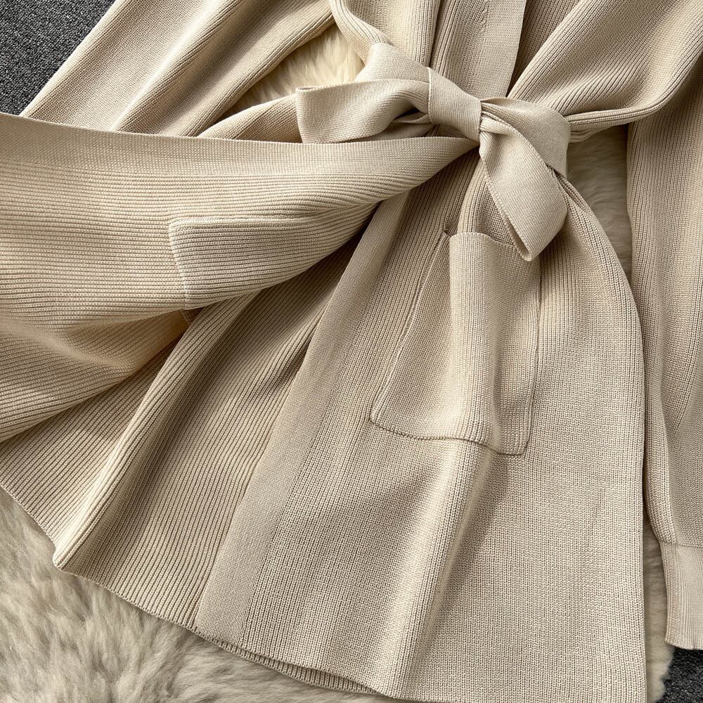 Nomikuma 秋 2 点セット弓包帯スリムウエストニットカーディガンコート + ウエストワイドレッグパンツ女性衣装 リボン オータム 秋物 ワイドパンツ kor94858302186