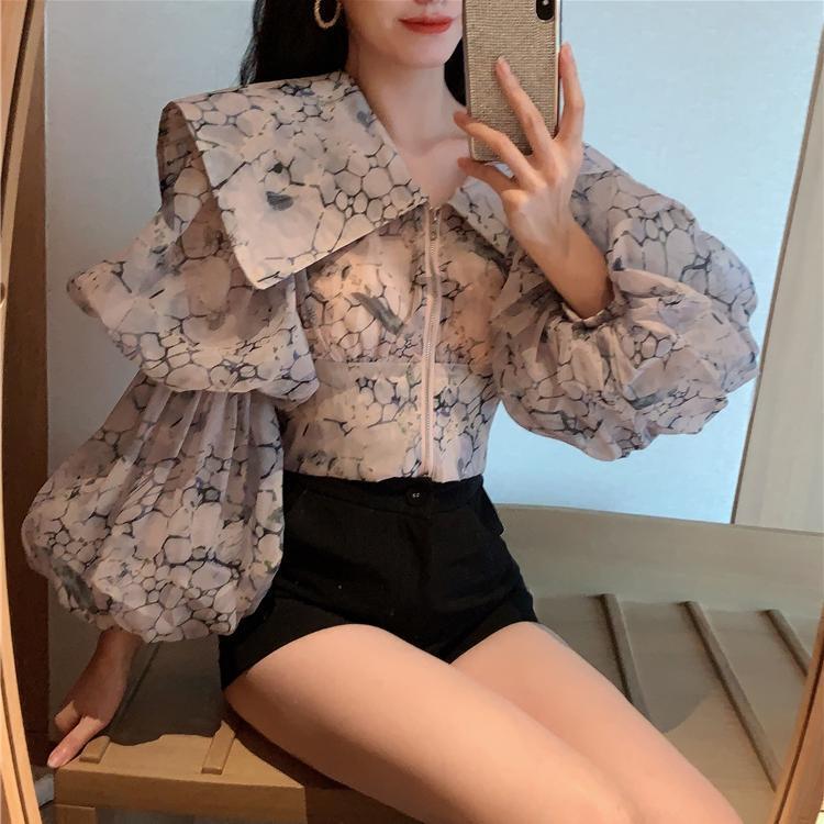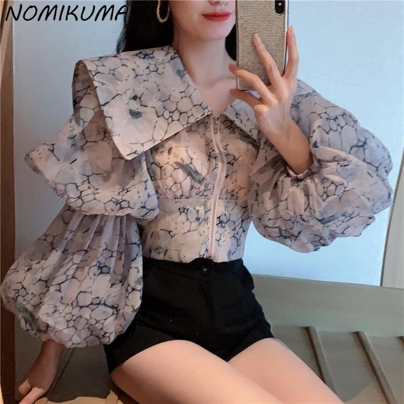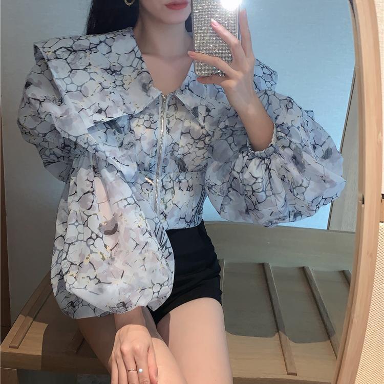 Nomikuma 2022 春印刷ブラウスセーラーカラーランタンスリーブ女性シャツジッパースリムショート スプリング 春物 kor28500765918