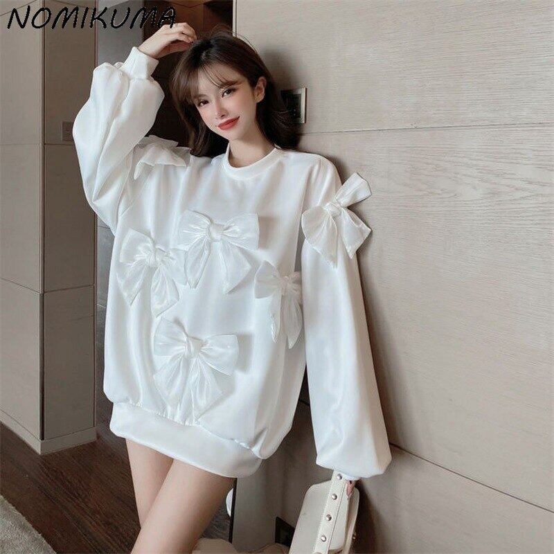 Nomikuma スウィートシックちょう結びトレーナー女性 2022 長袖 O ネックプルオーバージャンパー因果パーカートップ ロング リボン 大人ガーリー キュート カジュアル Oネック kor62585169467