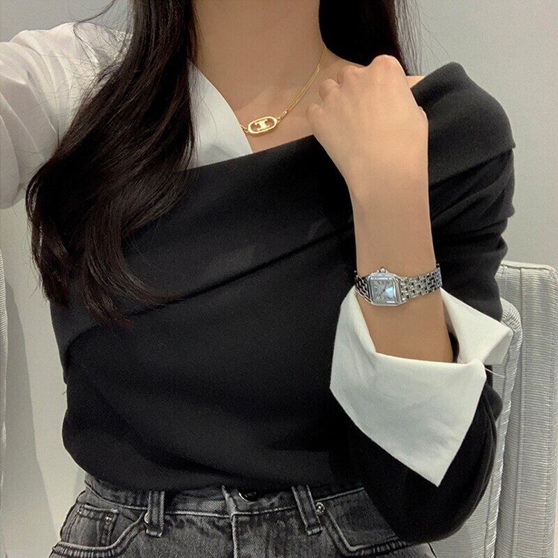 Nomikuma 黒白ヒットカラーパッチワーク女性ニットセクシーなストラップレス長袖ニットトップ因果 2021 春プルオーバー 6E226 ロング ホワイト ブラック スプリング 春物 kor2883148228