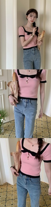 ノミクマ 夏 スリム ニット トップス ヒットカラーちょう結び スクエアカラー ニット 2022年 半袖 プルオーバー セーター ショート リボン ハーフスリーブ サマー 夏物 スクウェア kor38605812751
