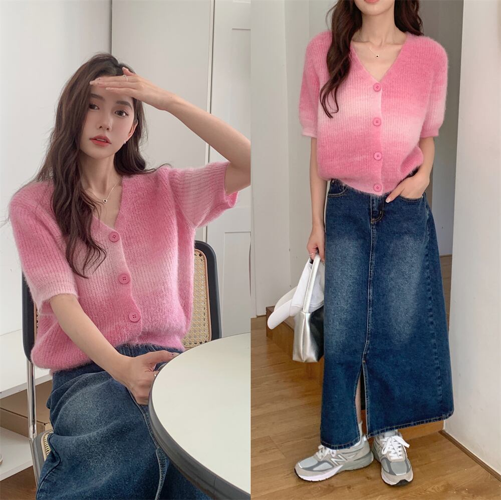 NomikumaグラデーションカラーVネック半袖ニットカーディガン2022秋ショート因果女性セーターニットコート ハーフスリーブ オータム 秋物 kor57534615739