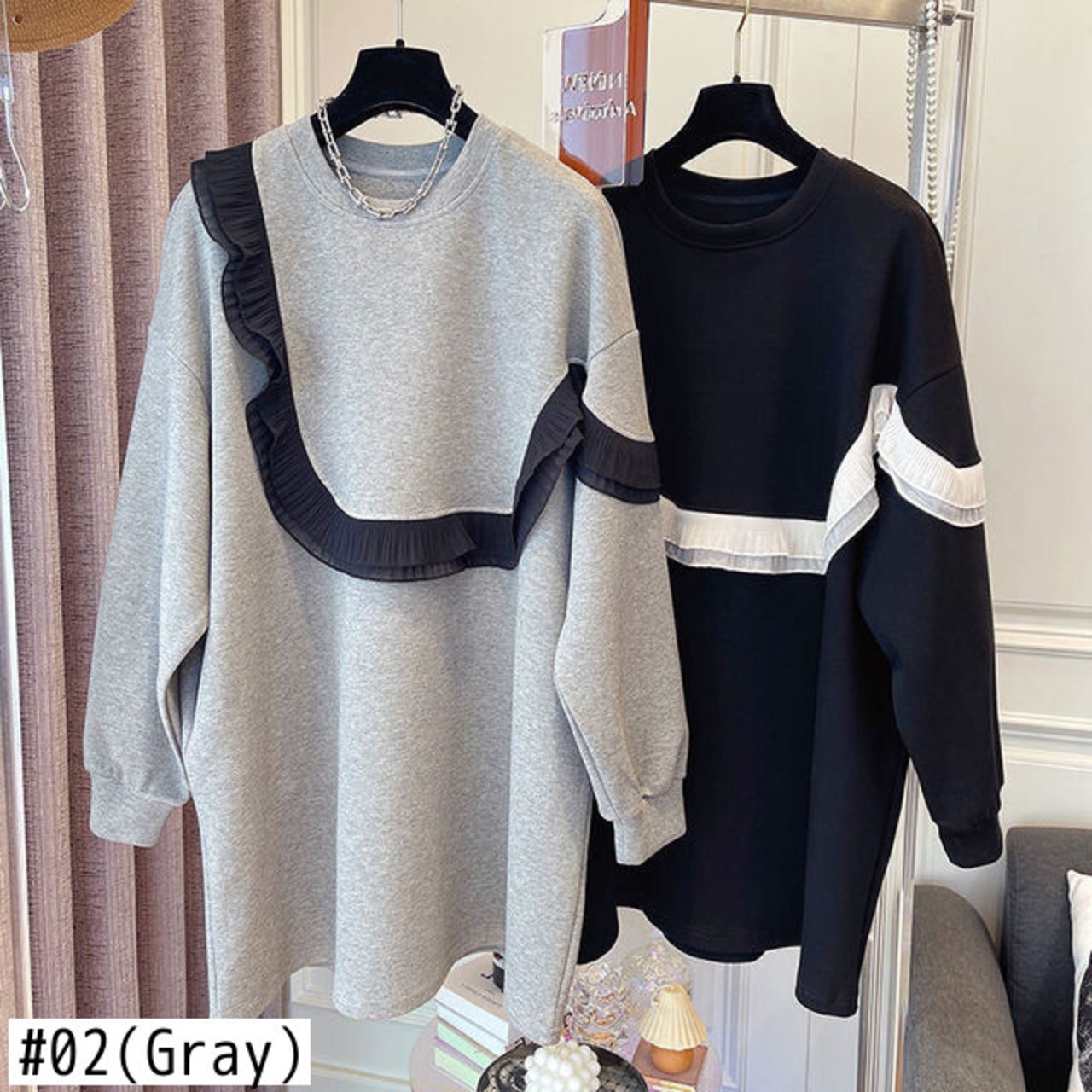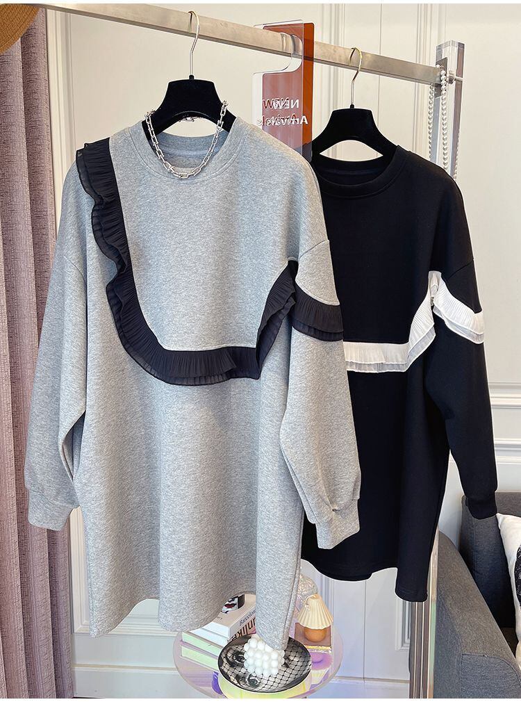 Nomikuma シックなメッシュ フリル ヒット カラー パッチワーク Sweatshrit 秋 2022 女性ジャンパー ミディアム ロング パーカー トップ オータム 秋物 kor55805860083