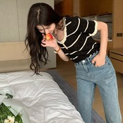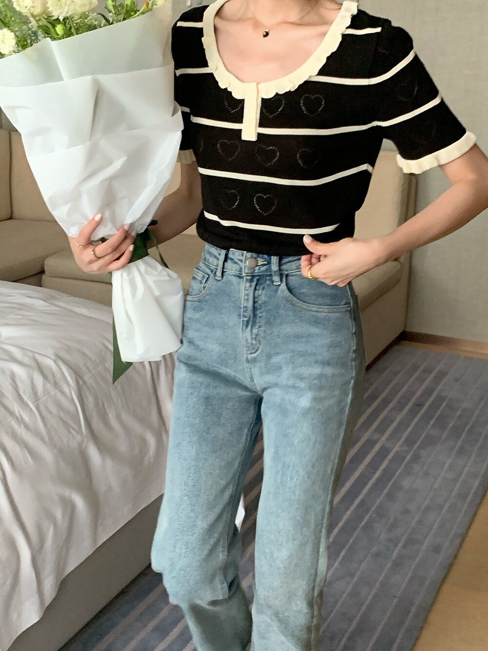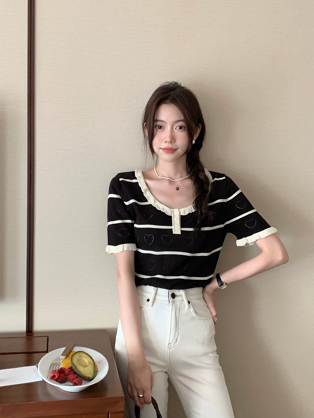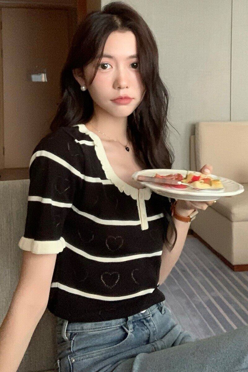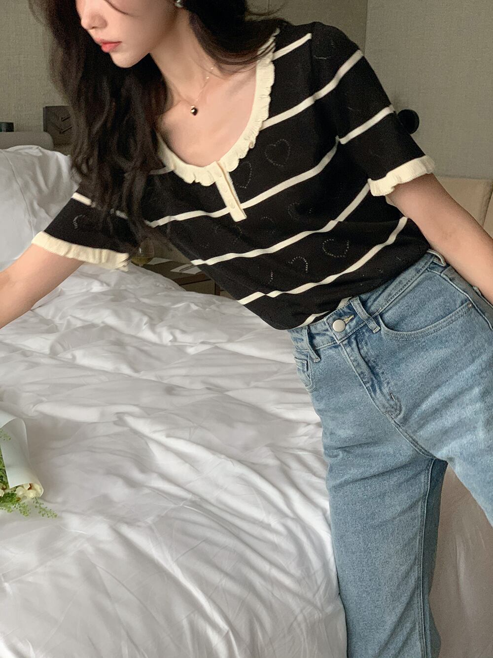 ノミクマ くり抜きラブハートニット フリル Oネック トップス カジュアル 半袖 2022年 夏 ニット セーター セーター ショート ハーフスリーブ サマー 夏物 kor452267346