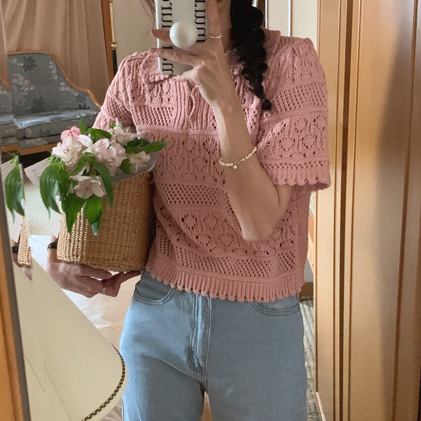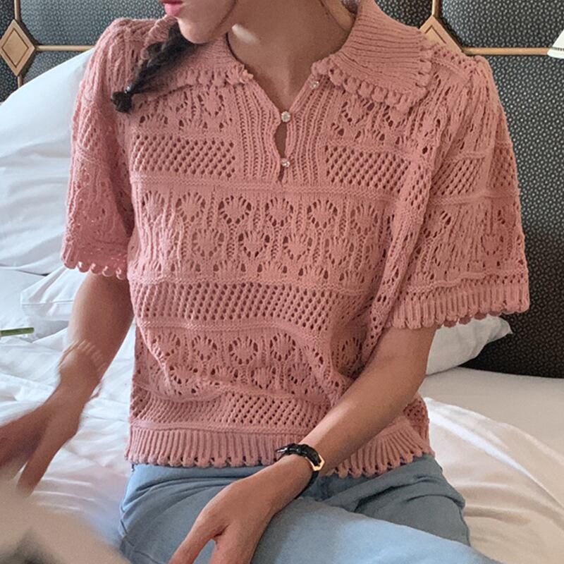Nomikuma フック中空アウトニットプルオーバー因果半袖ターンダウン襟セーター 2022 夏薄型女性ニット ショート ハーフスリーブ サマー 夏物 kor17032825828