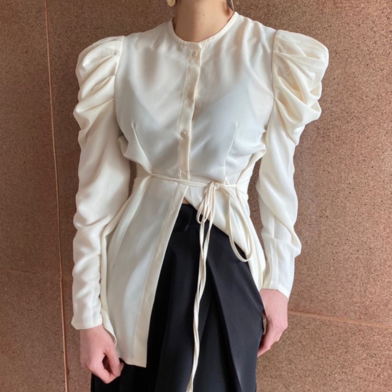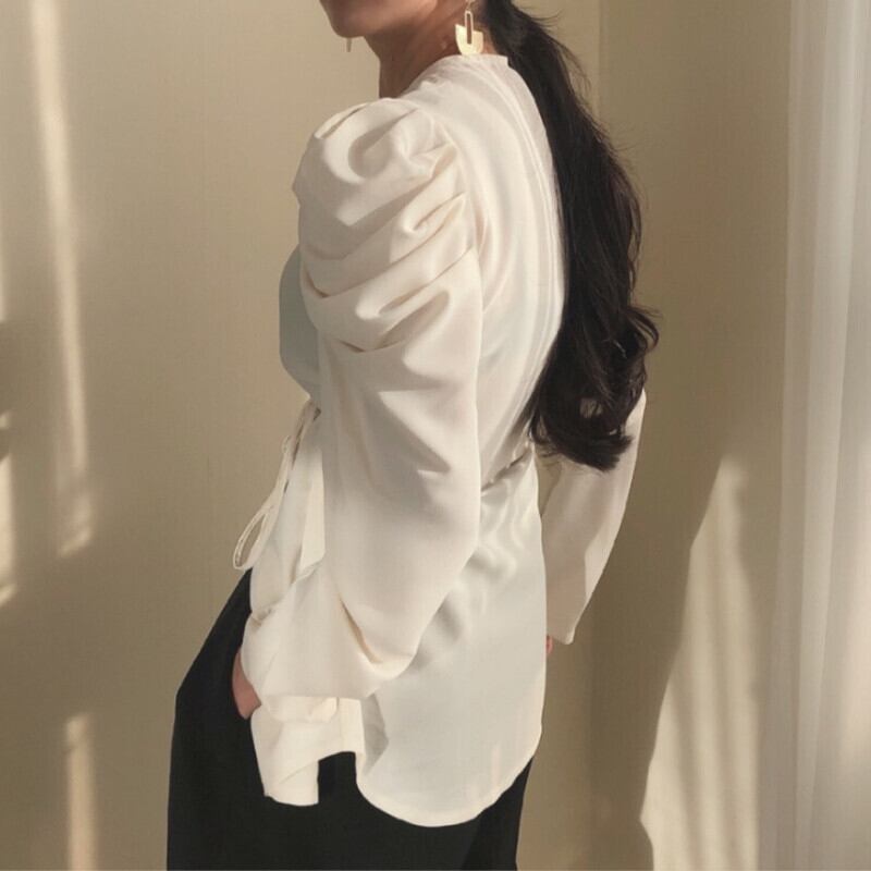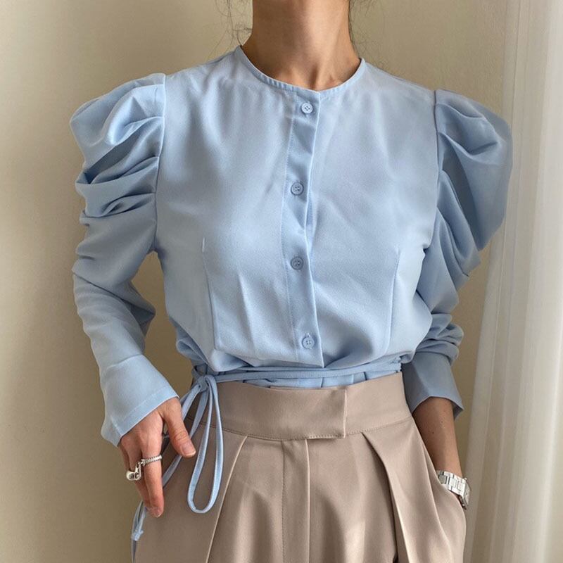 Nomikuma シックなひだパフスリーブブラウストップ女性シングルブレスト O ネックシャツ 2021 年秋 6X359 オータム 秋物 Oネック kor22982926041