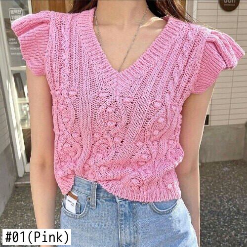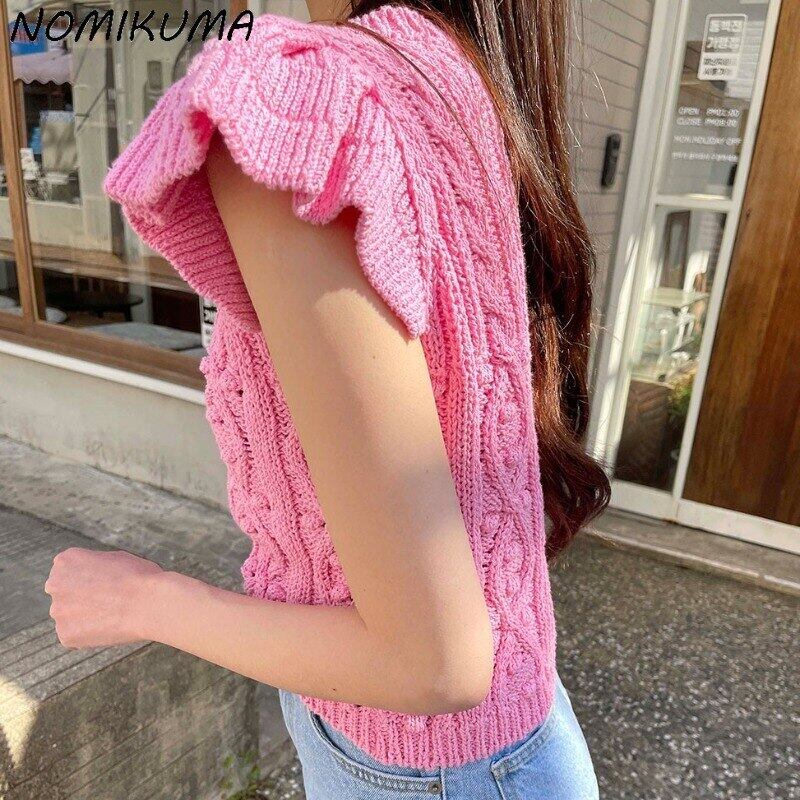 Nomikuma 女性フライングスリーブ V ネックニット夏トップスソリッドスタイルレディースニットツイストプルオーバーシックなセーター サマー 夏物 Vネック ソリッドカラー kor94949877130