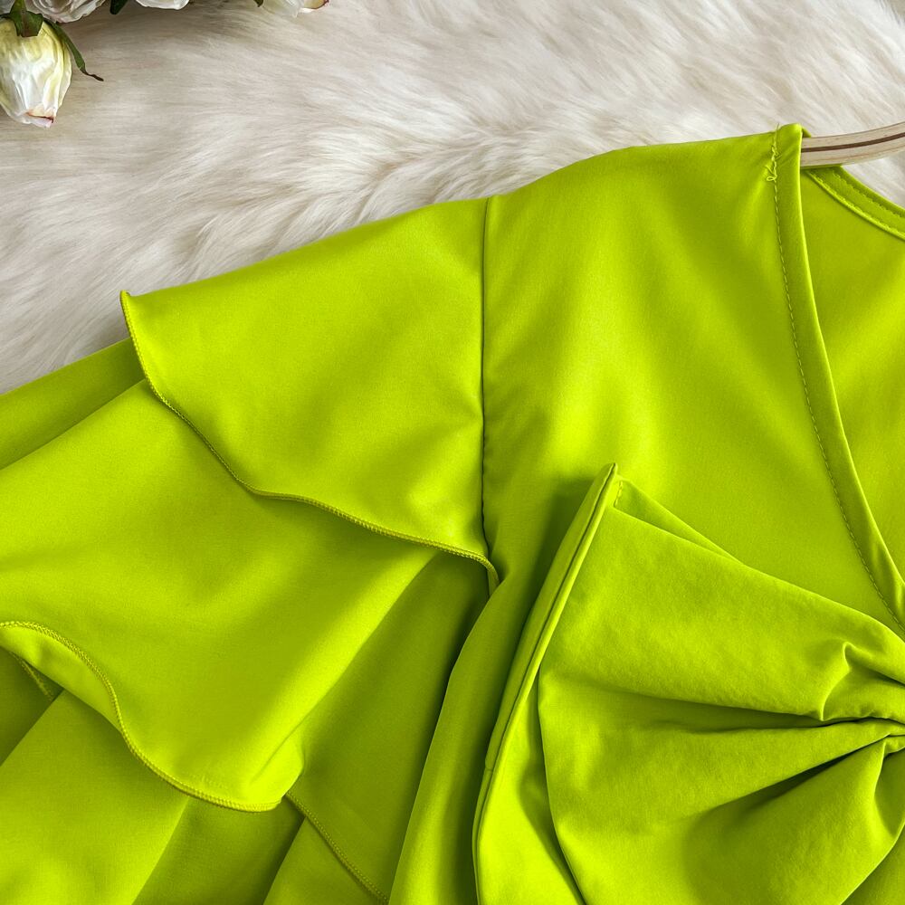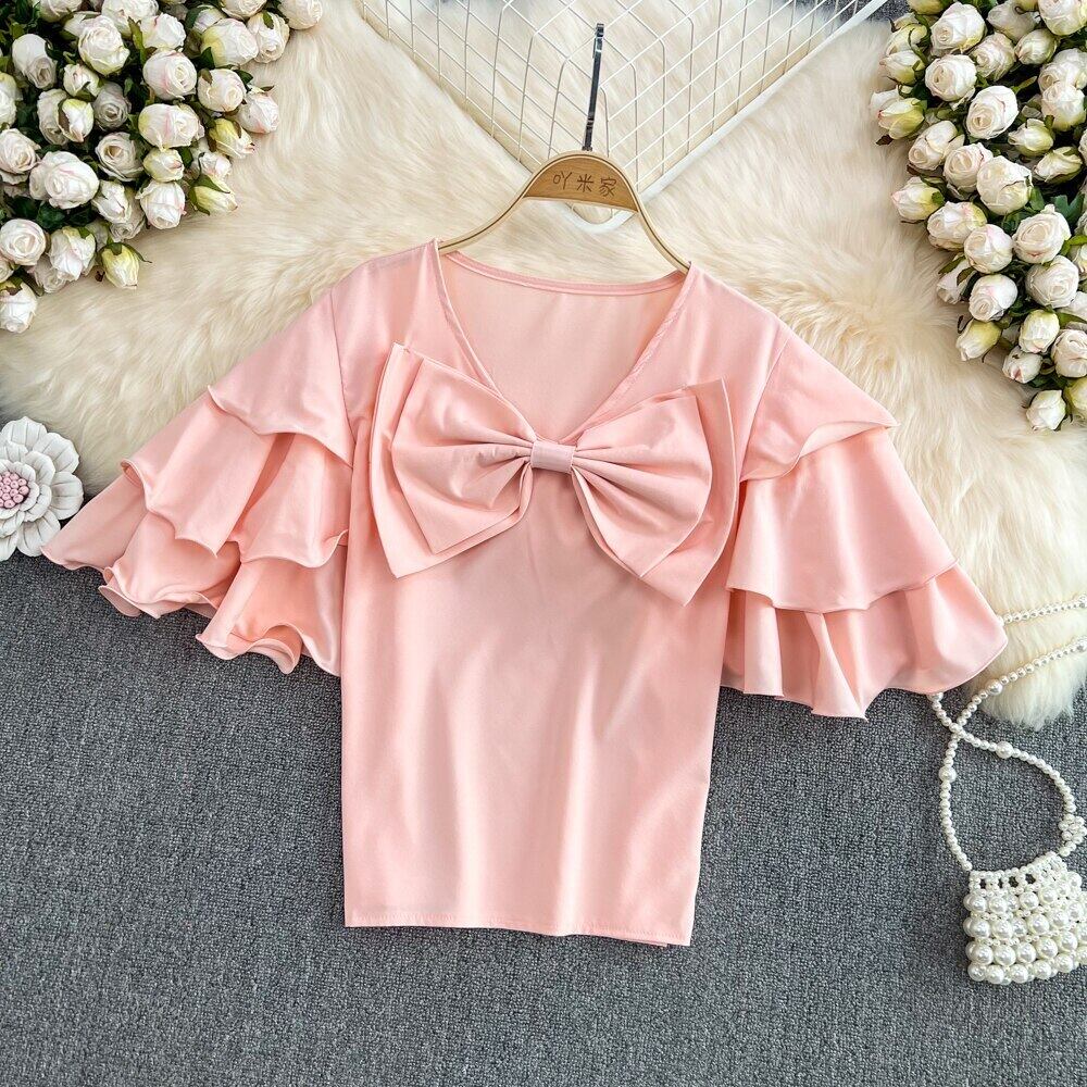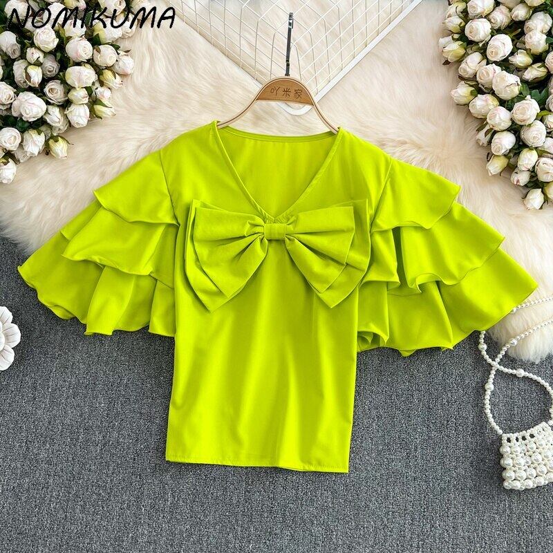 Nomikuma 2022 夏レディーストップスシックなレイヤードバタフライスリーブプルオーバーブラウス因果 V ネック無地ショートシャツ レッド サマー 夏物 Vネック ソリッドカラー kor10531172344