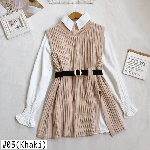 Nomikuma ニットウェア レディース 2022 秋冬 ベーシック 長袖 ブラウス + ニットベスト ベルト スリムウエスト 2点セット ロング オータム 秋物 ウィンター 冬物 ハーネス kor45601227681