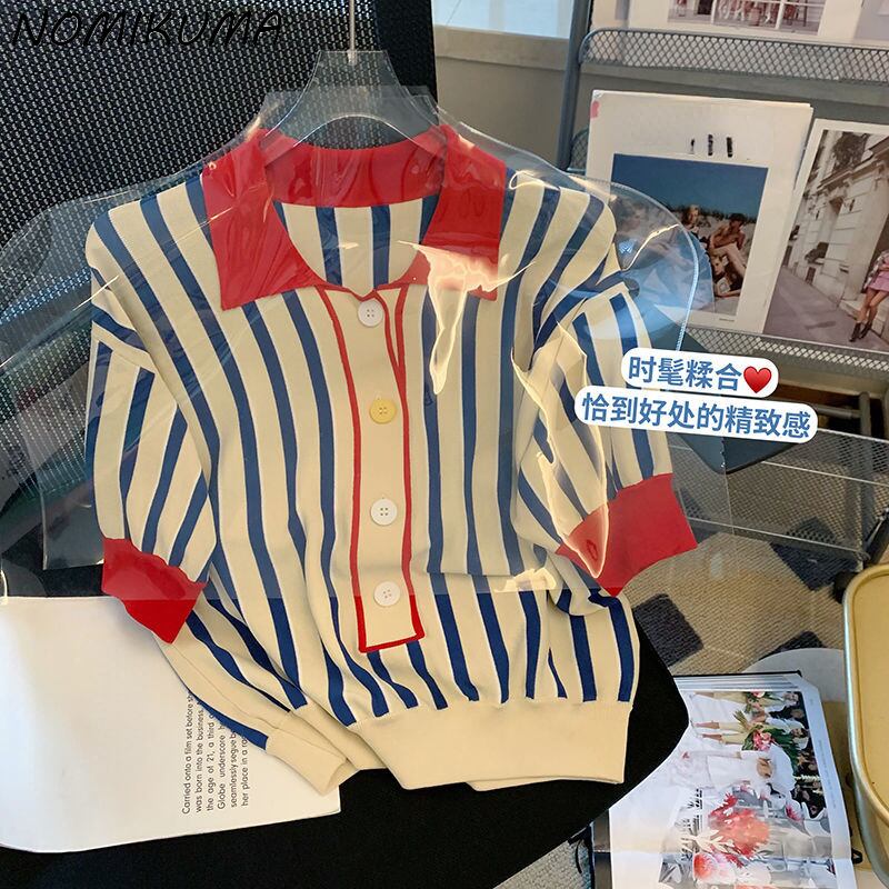 Nomikuma ヒットカラーストライプニット因果半袖ターンダウン襟女性セーター 2022 夏ニットトップス ショート ハーフスリーブ サマー 夏物 kor66467613601