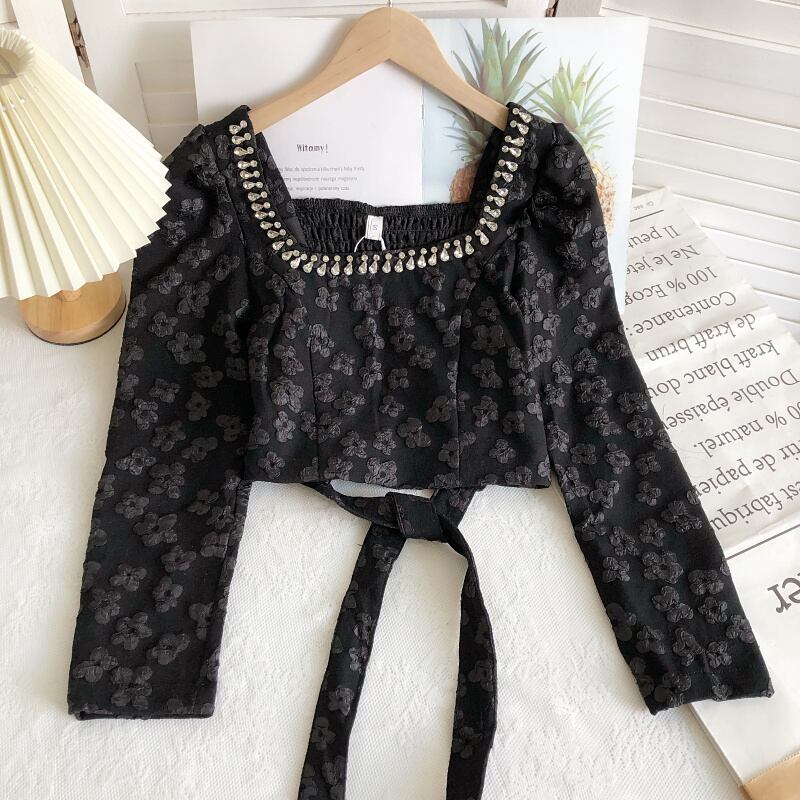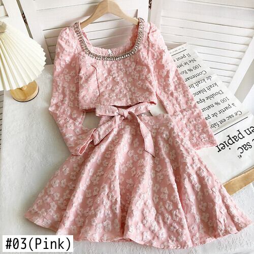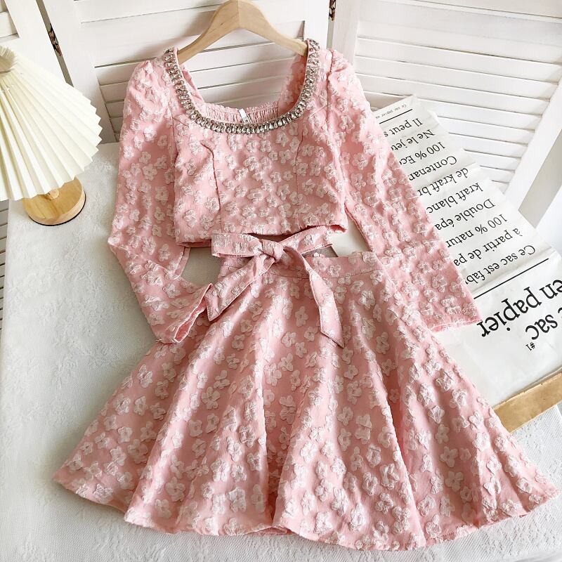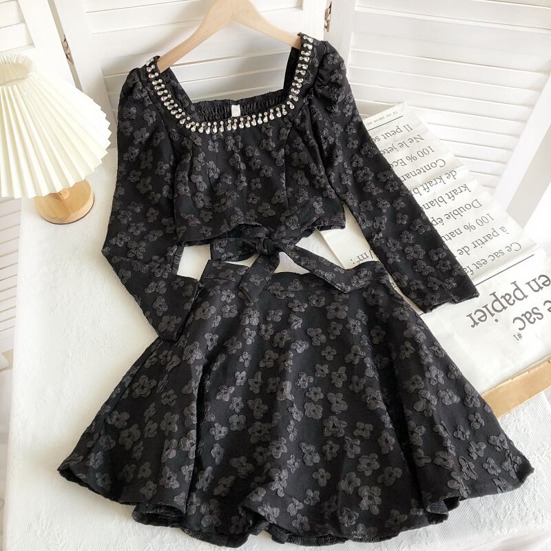 Nomikuma ジャカード レディース セット ダイヤモンド スクエアカラー パフスリーブ 蝶ネクタイ ショートブラウス + ウエスト Aライン ミニスカート 6N565 リボン スクウェア kor98627737817
