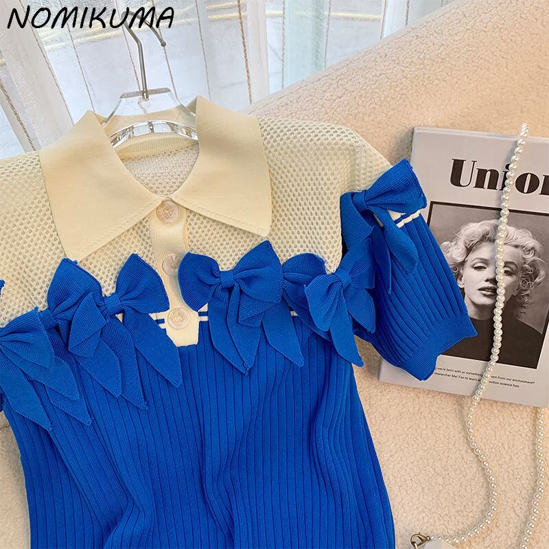 Nomikuma ターンダウン襟半袖ニットシックな中空アウトちょう結びヒットカラープルオーバー 2022 夏の女性のニットトップ ショート リボン ハーフスリーブ サマー 夏物 kor14065360337