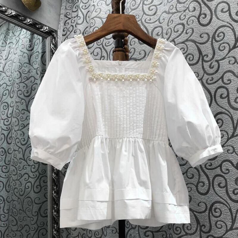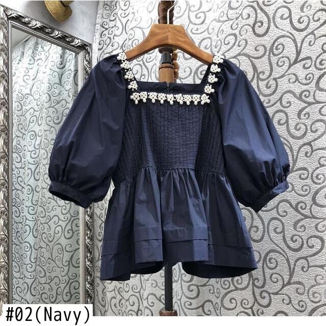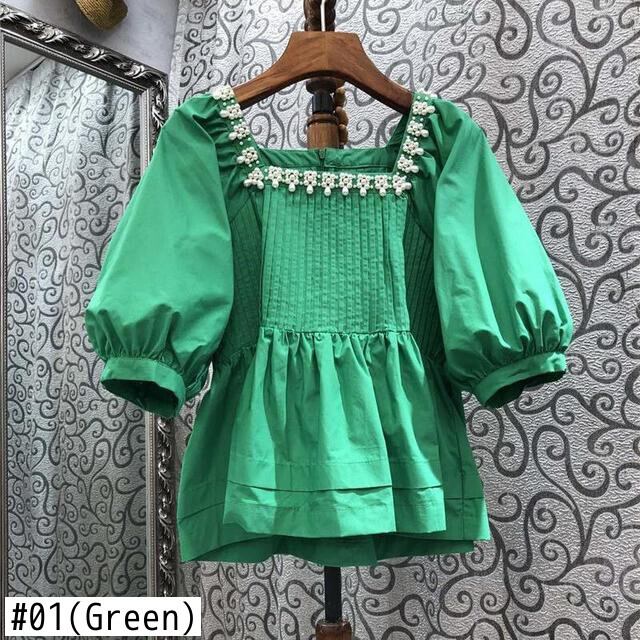 ノミクマ シック ビーズ スクエア カラー レディース トップ ブラウス スウィート パフ スリーブ ドール シャツ 2021 Blusones De 6K788 大人ガーリー キュート カジュアル スクウェア kor58159584790