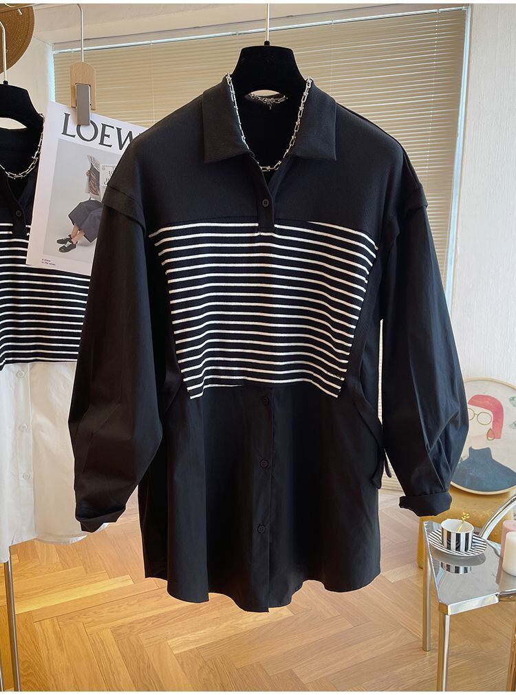ノミクマ 因果 ヒットカラー ストライプ パッチワーク フェイクツーピース ブラウス 因果 長袖 折り襟 2022年 秋 トップス ロング オータム 秋物 kor48711287631