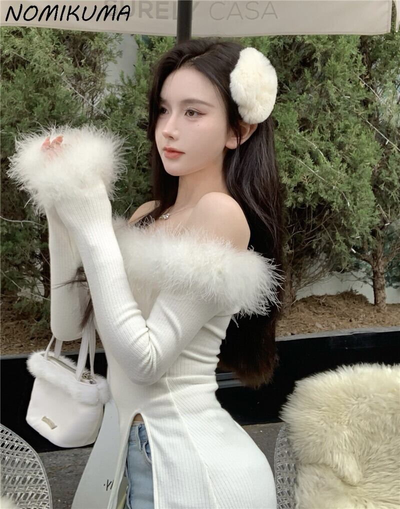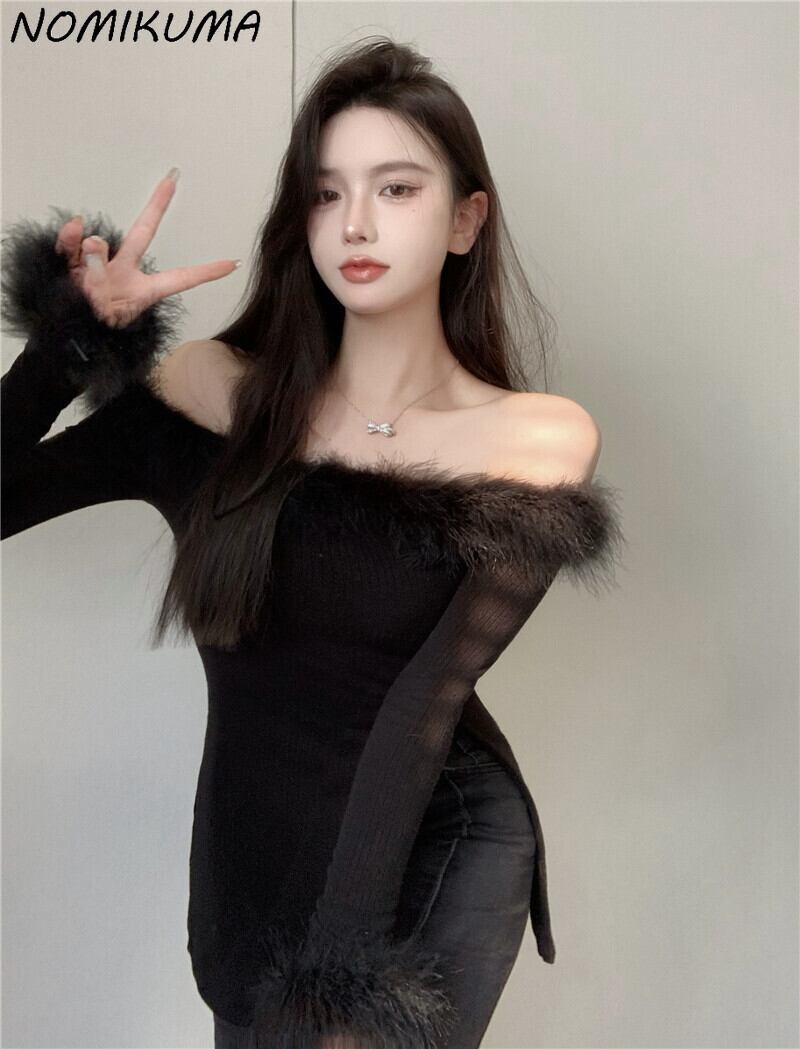 Nomikuma ファーパッチワークスラッシュネックストラップレスニット長袖スリムスプリット女性セーター春 2022 ニットトップス ロング スプリング 春物 kor19177079563
