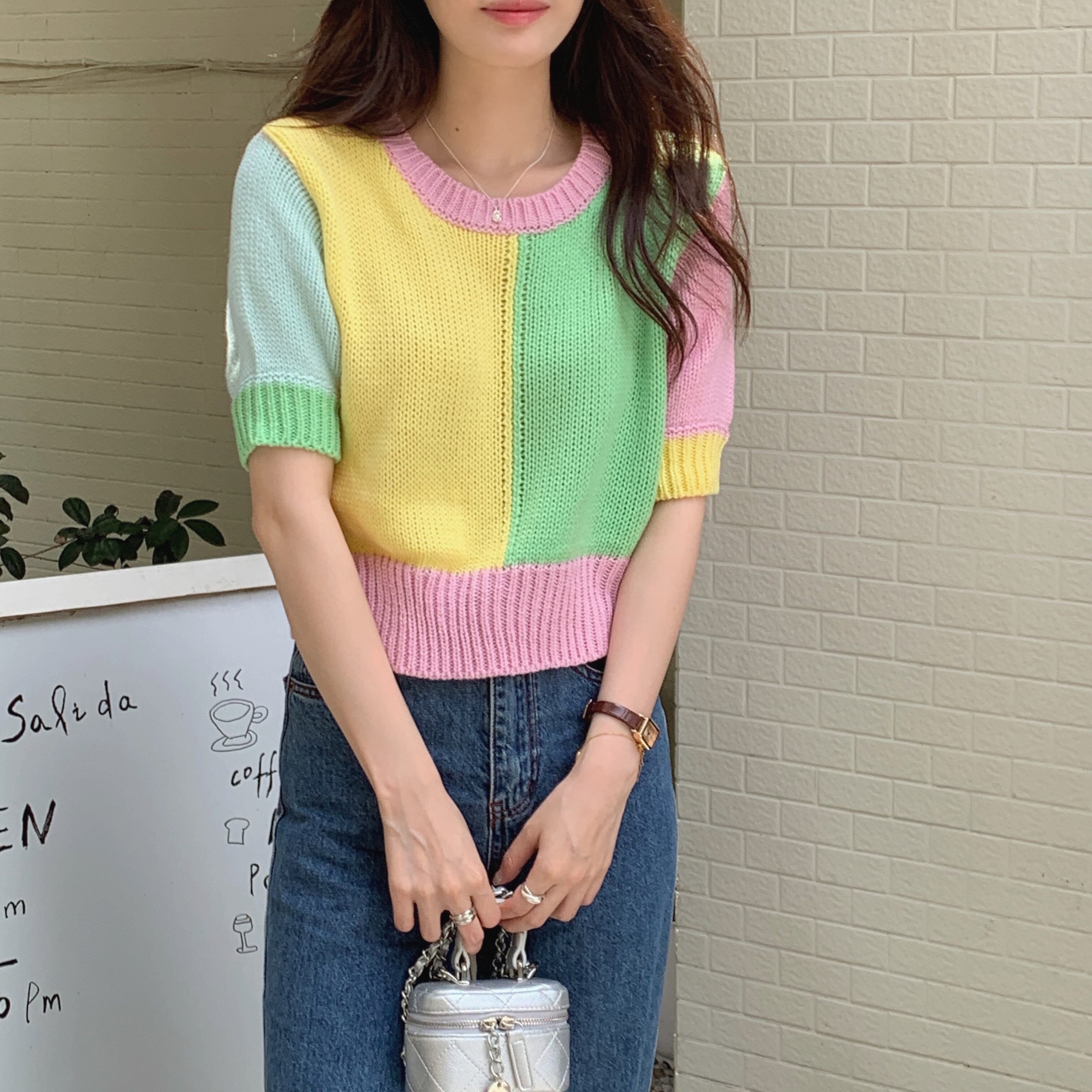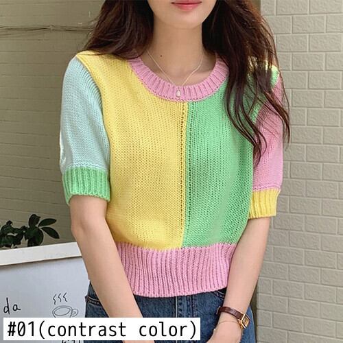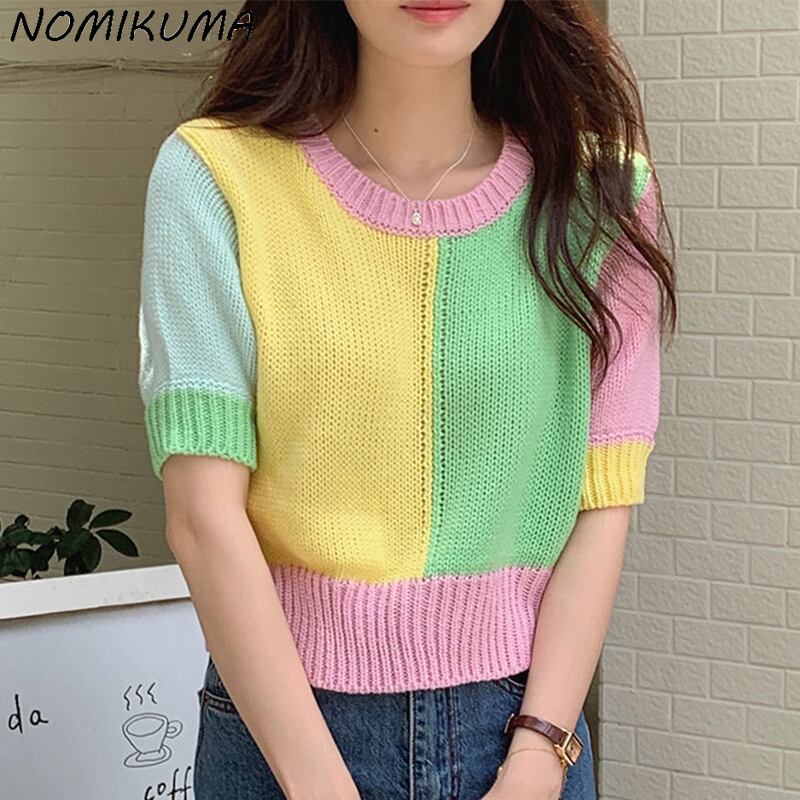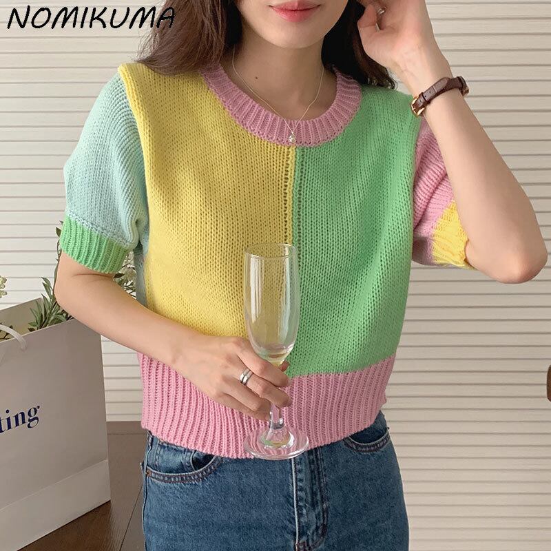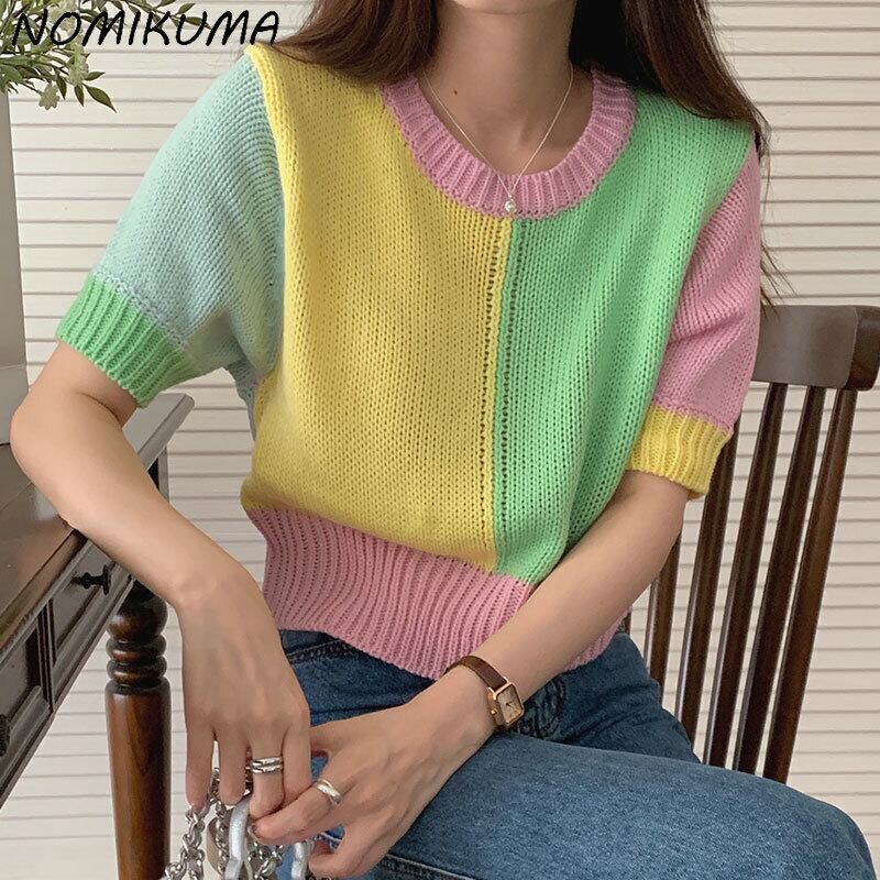 Nomikuma 女性の夏のセーター服コントラストカラープルオーバーニット因果 2022 半袖 O ネックニットトップス ショート ハーフスリーブ サマー 夏物 Oネック kor54915765959