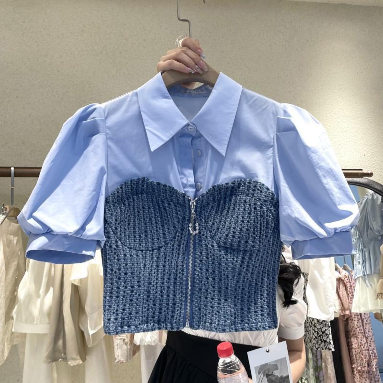 Nomikuma パッチワークフェイク二枚ショートブラウス 2022 夏シックなパフスリーブターンダウン襟女性シャツスリム サマー 夏物 kor21631046580