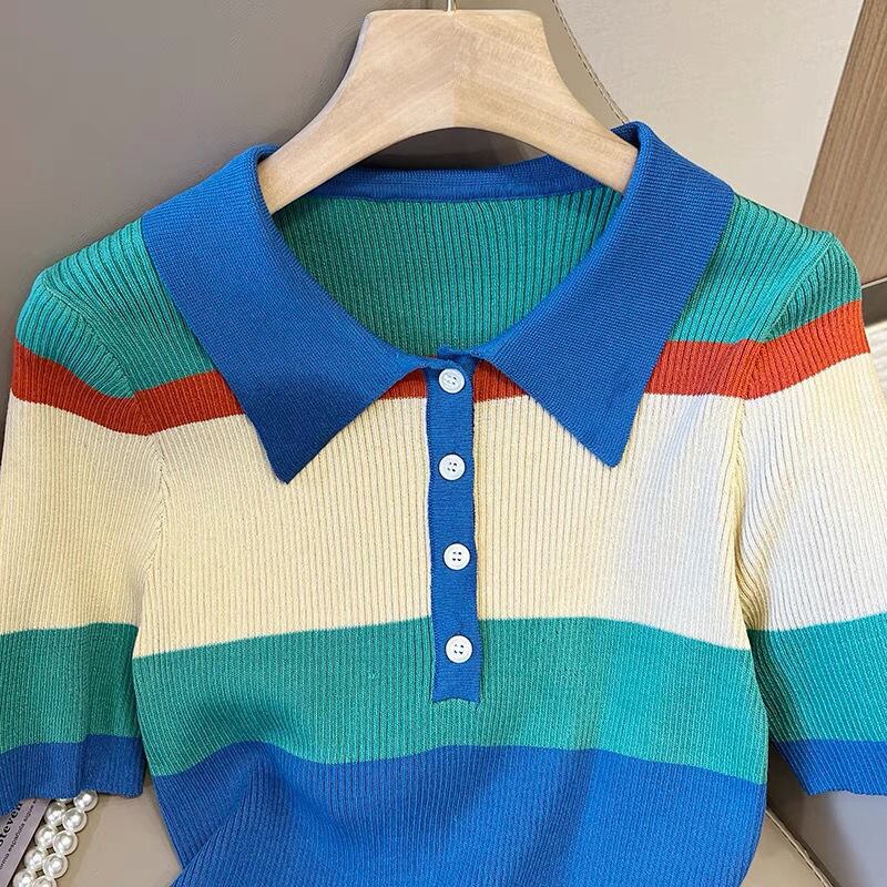 Nomikuma ヒットカラーストライプニットトップス 2022 夏半袖ターンダウン襟プルオーバー女性ニットセーター ショート ハーフスリーブ サマー 夏物 kor60179398225