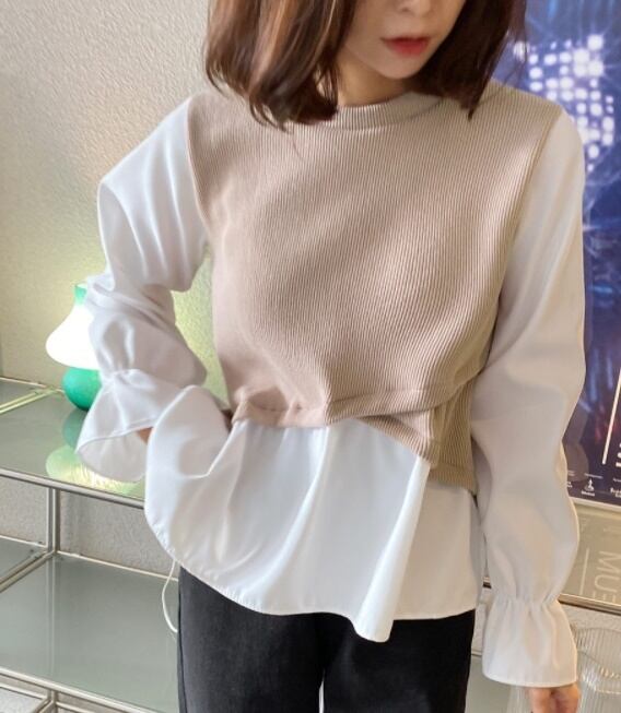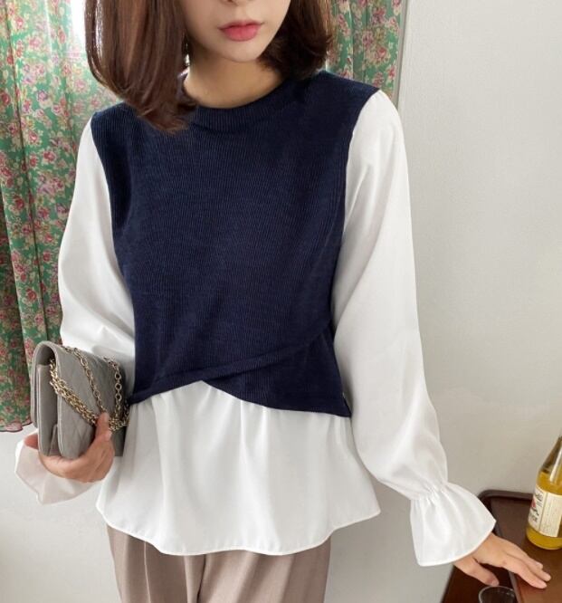 Nomikuma ブラウスパッチワークセーター女性フェイク二枚ニット因果 2022 秋プルオーバーニットトップス オータム 秋物 kor84991799097